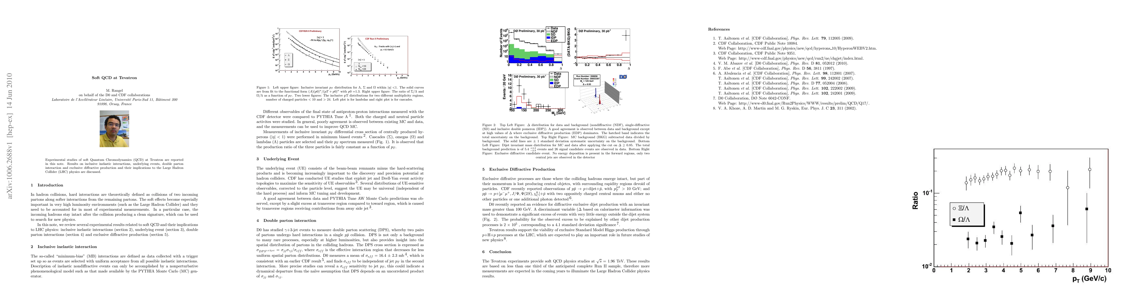 This paper reports experimental findings on soft QCD processes at the Tevatron, including inclusive inelastic interactions, underlying events, and exclusive diffractive production, with implications for understanding similar phenomena at the Large Hadron Collider (LHC).