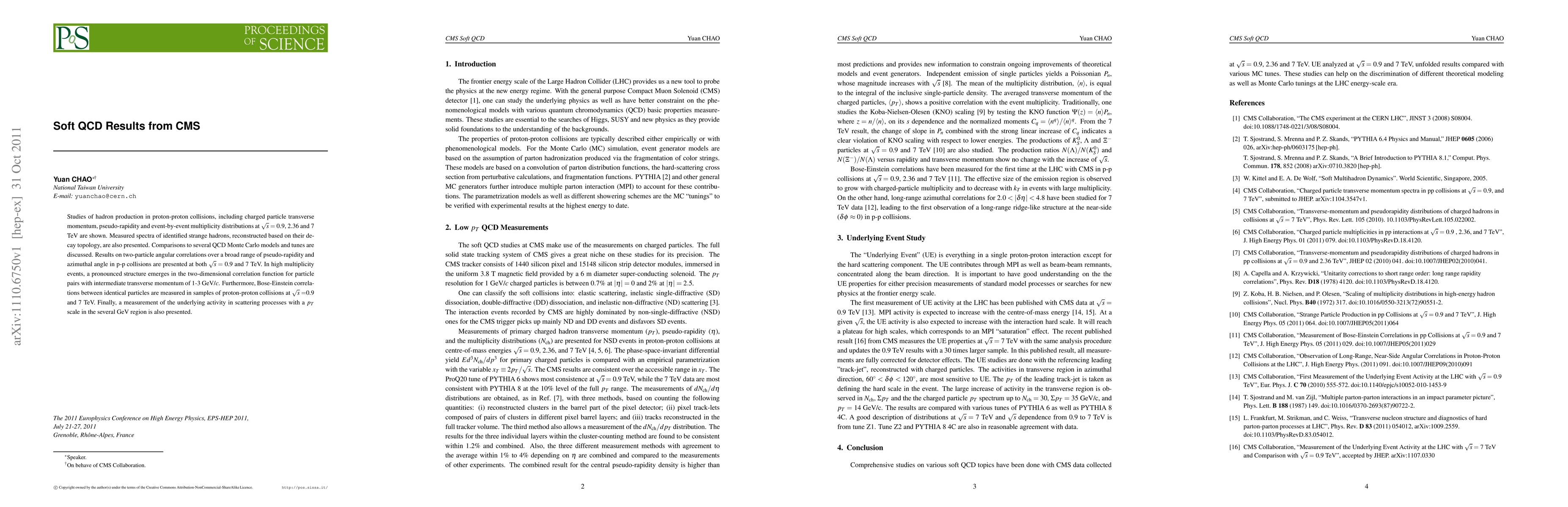 Studies of hadron production in proton-proton collisions, including charged particle transverse momentum, pseudo-rapidity and event-by-event multiplicity distributions at \sqrt{s} = 0.9, 2.36 and 7 TeV are shown. Measured spectra of identified strange hadrons, reconstructed based on their decay topology, are also presented. Comparisons to several QCD Monte Carlo models and tunes are discussed. Results on two-particle angular correlations over a broad range of pseudo-rapidity and azimuthal angle in p-p collisions are presented at both \sqrt{s} = 0.9 and 7 TeV. In high multiplicity events, a pronounced structure emerges in the two-dimensional correlation function for particle pairs with intermediate transverse momentum of 1-3 GeV/c. Furthermore, Bose-Einstein correlations between identical particles are measured in samples of proton-proton collisions at \sqrt{s} =0.9 and 7 TeV. Finally, a measurement of the underlying activity in scattering processes with a p_T scale in the several GeV region is also presented.