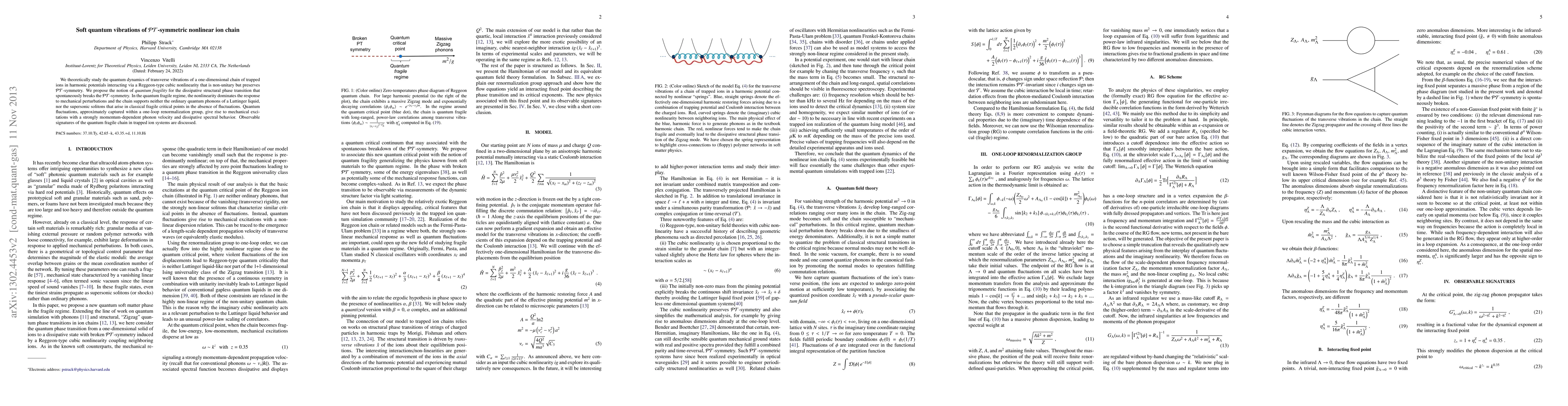 We theoretically study the quantum dynamics of transverse vibrations of a one-dimensional chain of trapped ions in harmonic potentials interacting via a Reggeon-type cubic nonlinearity that is nonunitary but preserves PT symmetry. We propose the notion of quantum fragility for the dissipative structural phase transition that spontaneously breaks the PT symmetry. In the quantum fragile regime, the nonlinearity dominates the response to mechanical perturbations and the chain supports neither the ordinary quantum phonons of a Luttinger liquid, nor the supersonic solitons that arise in classical fragile critical points in the absence of fluctuations. Quantum fluctuations, approximately captured within a one-loop renormalization group, give rise to mechanical excitations with a strongly momentum-dependent phonon velocity and dissipative spectral behavior. Observable signatures of the quantum fragile chain in trapped ion systems are discussed.
