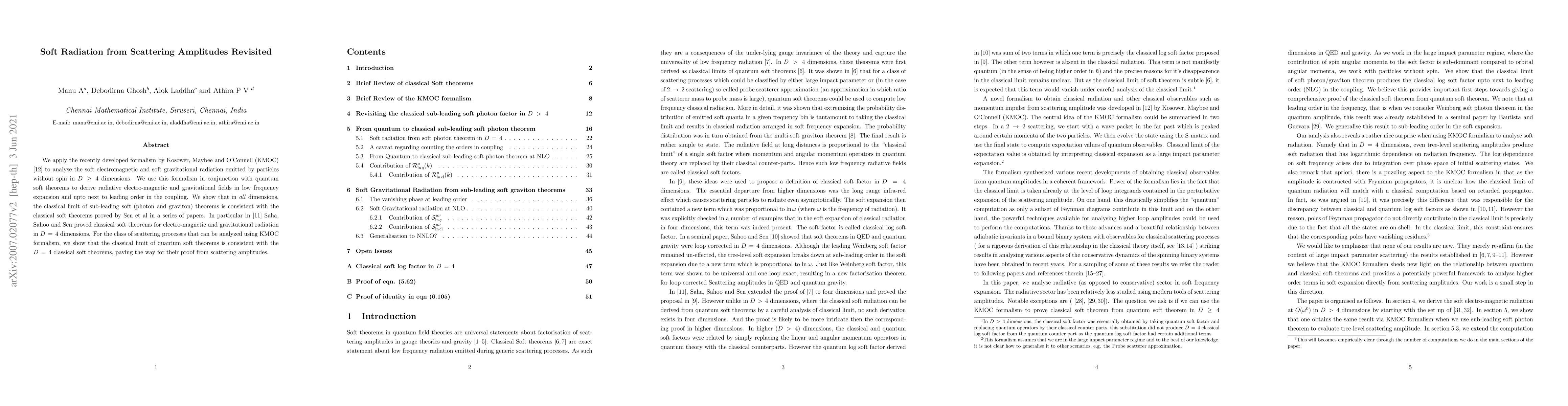 This research uses the Kosower, Maybee, and O'Connell (KMO) formalism to analyze soft electromagnetic and gravitational radiation from particle scattering in four and higher dimensions. It shows consistency between the classical limit of quantum soft theorems and classical soft theorems proven by Sen et al, paving the way for proving these theorems from scattering amplitudes.