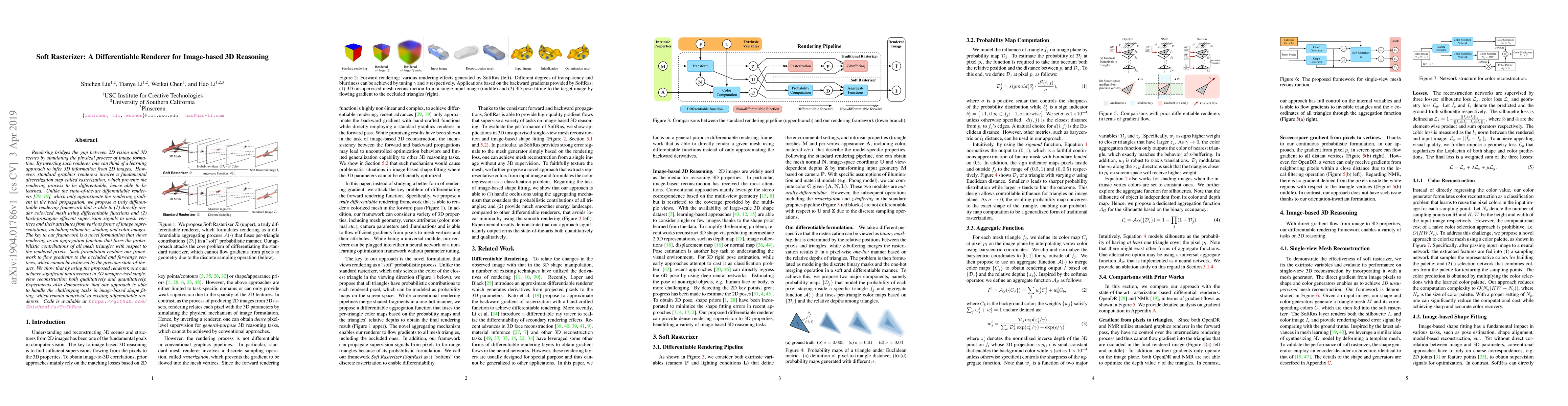 Rendering bridges the gap between 2D vision and 3D scenes by simulating the physical process of image formation. By inverting such renderer, one can think of a learning approach to infer 3D information from 2D images. However, standard graphics renderers involve a fundamental discretization step called rasterization, which prevents the rendering process to be differentiable, hence able to be learned. Unlike the state-of-the-art differentiable renderers, which only approximate the rendering gradient in the back propagation, we propose a truly differentiable rendering framework that is able to (1) directly render colorized mesh using differentiable functions and (2) back-propagate efficient supervision signals to mesh vertices and their attributes from various forms of image representations, including silhouette, shading and color images. The key to our framework is a novel formulation that views rendering as an aggregation function that fuses the probabilistic contributions of all mesh triangles with respect to the rendered pixels. Such formulation enables our framework to flow gradients to the occluded and far-range vertices, which cannot be achieved by the previous state-of-the-arts. We show that by using the proposed renderer, one can achieve significant improvement in 3D unsupervised single-view reconstruction both qualitatively and quantitatively. Experiments also demonstrate that our approach is able to handle the challenging tasks in image-based shape fitting, which remain nontrivial to existing differentiable renderers.