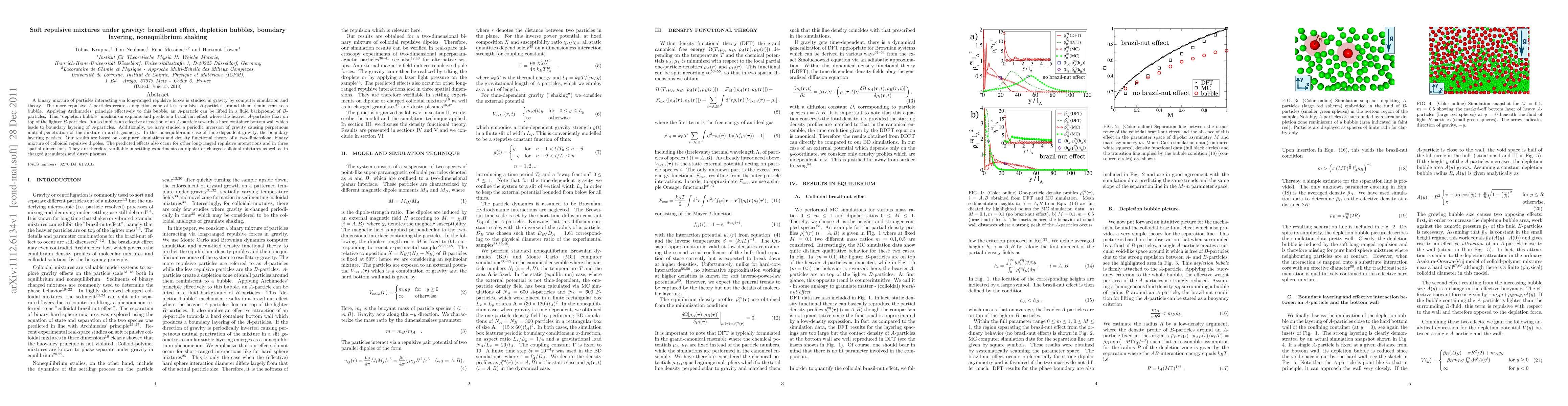 This paper investigates binary mixtures of particles under gravity, explaining the "brazil-nut effect" and "depletion bubbles" via computer simulations and theory. The heavier particles float atop lighter ones due to a depletion zone around them, and boundary layering occurs near container walls.