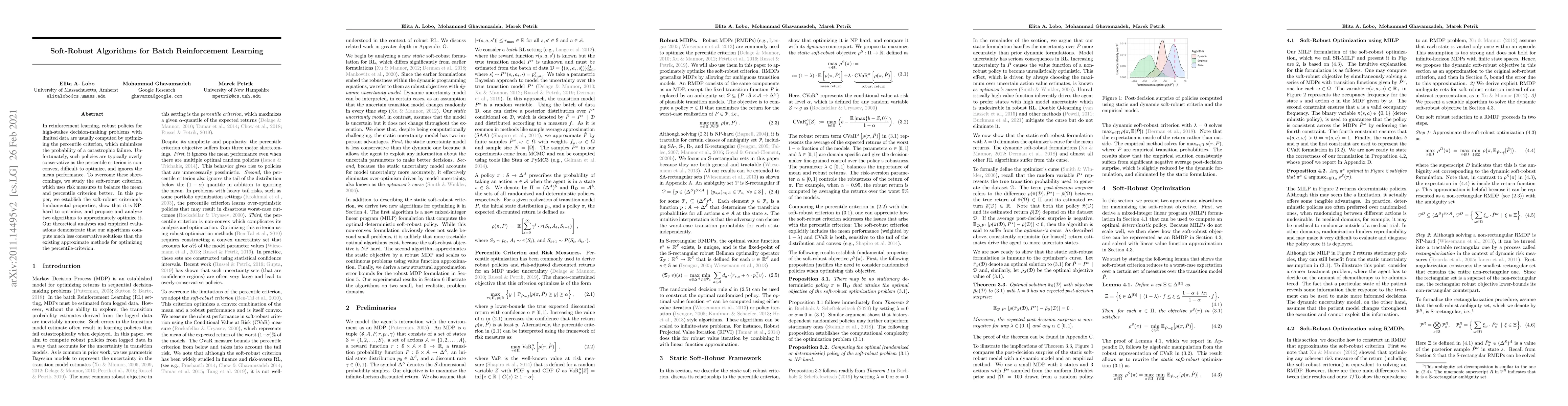 This paper introduces soft-robust algorithms for batch reinforcement learning, addressing the limitations of existing percentile-based methods by balancing mean and percentile performance through a new soft-robust criterion. The authors propose two algorithms to optimize this criterion and show they yield less conservative policies compared to traditional methods.
