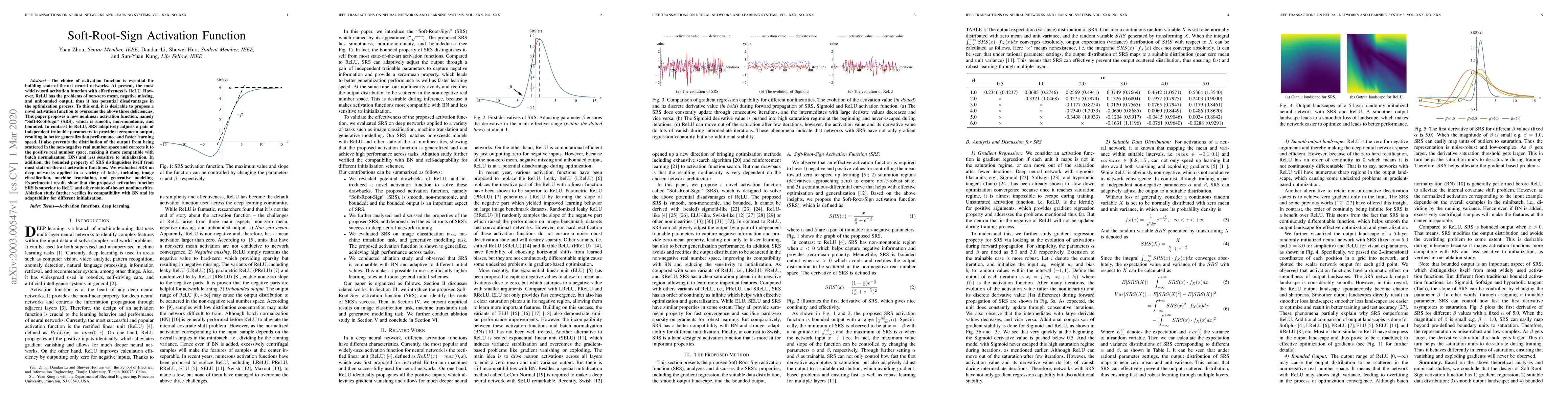 The paper introduces a novel "Soft-Root-Sign" (SRS) activation function designed to address the limitations of ReLU, offering a smooth, non-monotonic, bounded, and zero-mean property. SRS demonstrates better generalization and faster learning speed across various tasks, showing competitive performance against ReLU and other advanced activation functions.