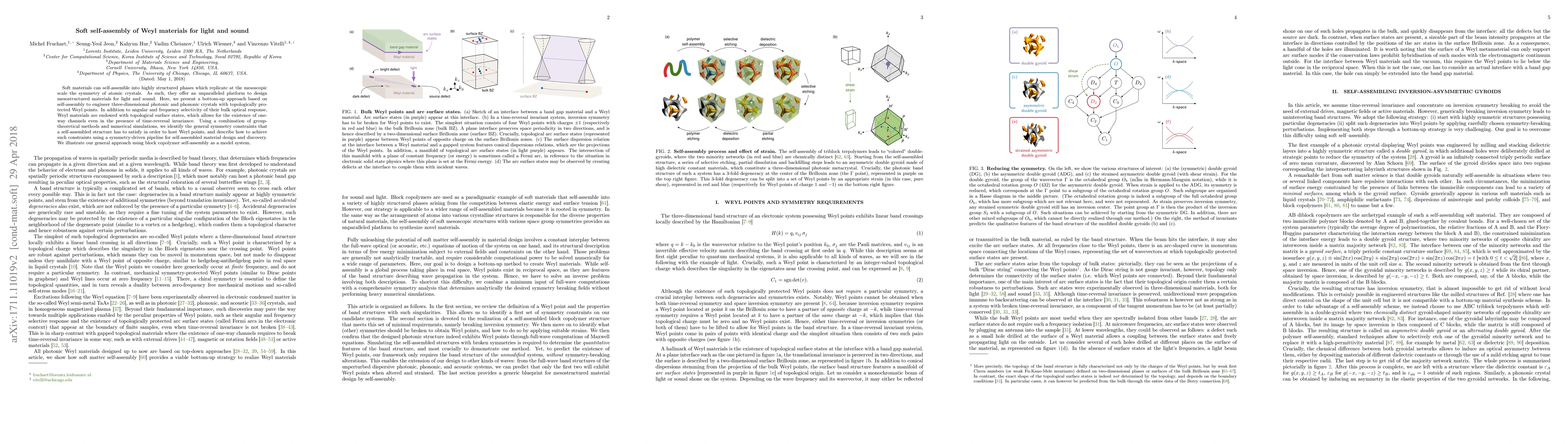Soft materials can self-assemble into highly structured phases which replicate at the mesoscopic scale the symmetry of atomic crystals. As such, they offer an unparalleled platform to design mesostructured materials for light and sound. Here, we present a bottom-up approach based on self-assembly to engineer three-dimensional photonic and phononic crystals with topologically protected Weyl points. In addition to angular and frequency selectivity of their bulk optical response, Weyl materials are endowed with topological surface states, which allows for the existence of one-way channels even in the presence of time-reversal invariance. Using a combination of group-theoretical methods and numerical simulations, we identify the general symmetry constraints that a self-assembled structure has to satisfy in order to host Weyl points, and describe how to achieve such constraints using a symmetry-driven pipeline for self-assembled material design and discovery. We illustrate our general approach using block copolymer self-assembly as a model system.
