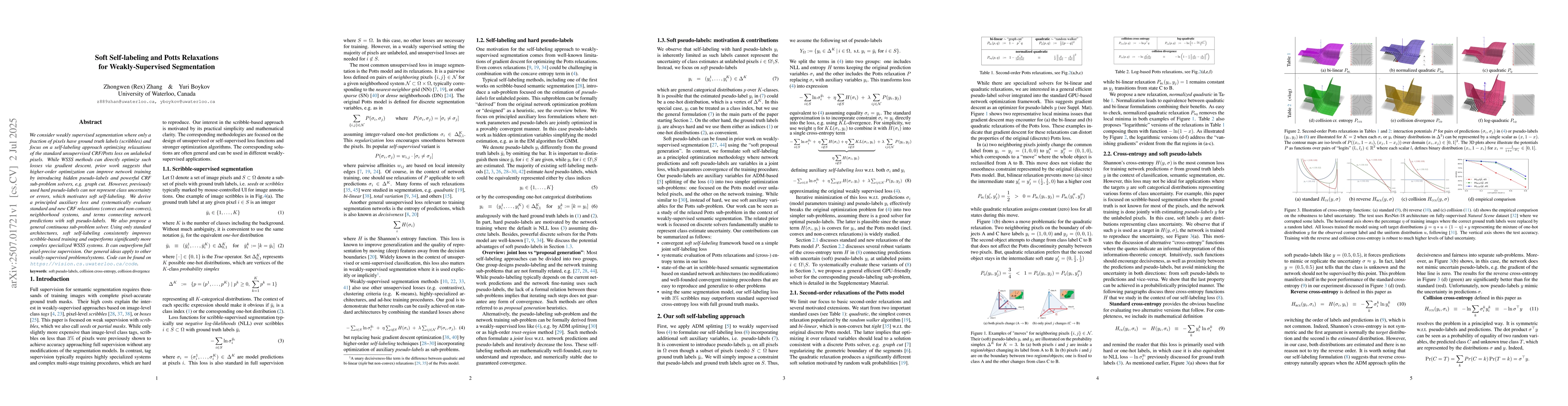 We consider weakly supervised segmentation where only a fraction of pixels have ground truth labels (scribbles) and focus on a self-labeling approach optimizing relaxations of the standard unsupervised CRF/Potts loss on unlabeled pixels. While WSSS methods can directly optimize such losses via gradient descent, prior work suggests that higher-order optimization can improve network training by introducing hidden pseudo-labels and powerful CRF sub-problem solvers, e.g. graph cut. However, previously used hard pseudo-labels can not represent class uncertainty or errors, which motivates soft self-labeling. We derive a principled auxiliary loss and systematically evaluate standard and new CRF relaxations (convex and non-convex), neighborhood systems, and terms connecting network predictions with soft pseudo-labels. We also propose a general continuous sub-problem solver. Using only standard architectures, soft self-labeling consistently improves scribble-based training and outperforms significantly more complex specialized WSSS systems. It can outperform full pixel-precise supervision. Our general ideas apply to other weakly-supervised problems/systems.