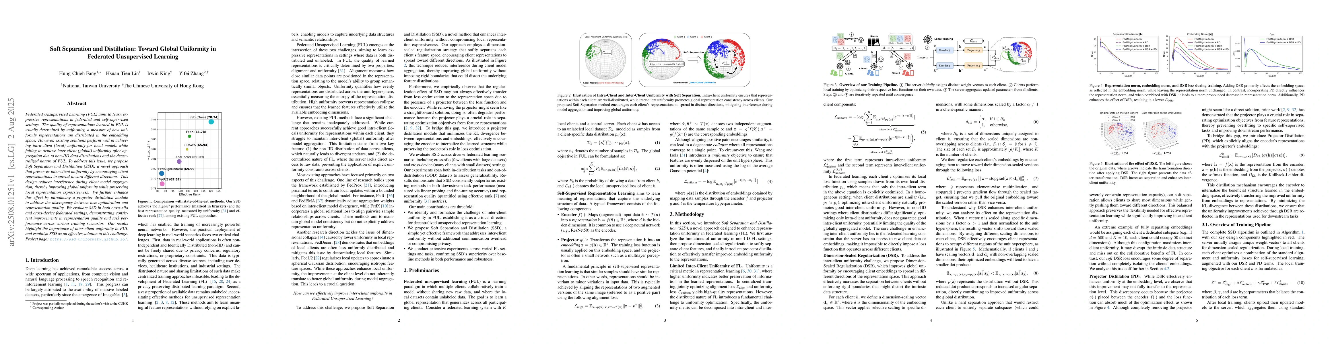 Federated Unsupervised Learning (FUL) aims to learn expressive representations in federated and self-supervised settings. The quality of representations learned in FUL is usually determined by uniformity, a measure of how uniformly representations are distributed in the embedding space. However, existing solutions perform well in achieving intra-client (local) uniformity for local models while failing to achieve inter-client (global) uniformity after aggregation due to non-IID data distributions and the decentralized nature of FUL. To address this issue, we propose Soft Separation and Distillation (SSD), a novel approach that preserves inter-client uniformity by encouraging client representations to spread toward different directions. This design reduces interference during client model aggregation, thereby improving global uniformity while preserving local representation expressiveness. We further enhance this effect by introducing a projector distillation module to address the discrepancy between loss optimization and representation quality. We evaluate SSD in both cross-silo and cross-device federated settings, demonstrating consistent improvements in representation quality and task performance across various training scenarios. Our results highlight the importance of inter-client uniformity in FUL and establish SSD as an effective solution to this challenge. Project page: https://ssd-uniformity.github.io/