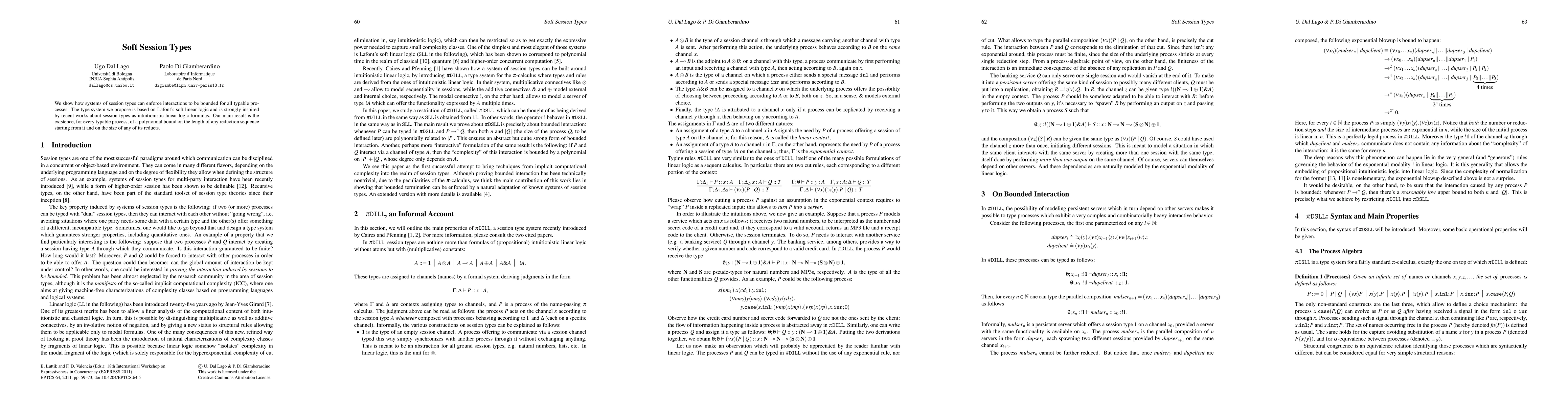 This paper introduces a type system based on Lafont's soft linear logic to enforce bounded interactions for session types, ensuring that all typable processes have a polynomial bound on reduction sequence length and reduct size. The system leverages intuitionistic linear logic formulas to achieve these constraints.