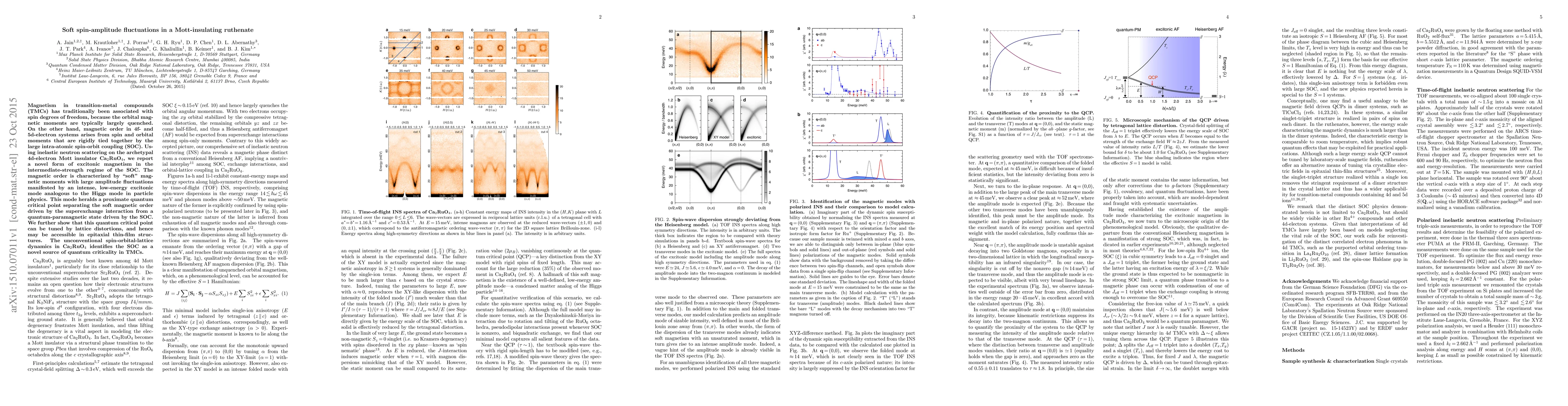 Magnetism in transition-metal compounds (TMCs) has traditionally been associated with spin degrees of freedom, because the orbital magnetic moments are typically largely quenched. On the other hand, magnetic order in 4f- and 5d-electron systems arises from spin and orbital moments that are rigidly tied together by the large intra-atomic spin-orbit coupling (SOC). Using inelastic neutron scattering on the archetypal 4d-electron Mott insulator Ca$_2$RuO$_4$, we report a novel form of excitonic magnetism in the intermediate-strength regime of the SOC. The magnetic order is characterized by ``soft'' magnetic moments with large amplitude fluctuations manifested by an intense, low-energy excitonic mode analogous to the Higgs mode in particle physics. This mode heralds a proximate quantum critical point separating the soft magnetic order driven by the superexchange interaction from a quantum-paramagnetic state driven by the SOC. We further show that this quantum critical point can be tuned by lattice distortions, and hence may be accessible in epitaxial thin-film structures. The unconventional spin-orbital-lattice dynamics in Ca$_2$RuO$_4$ identifies the SOC as a novel source of quantum criticality in TMCs.
