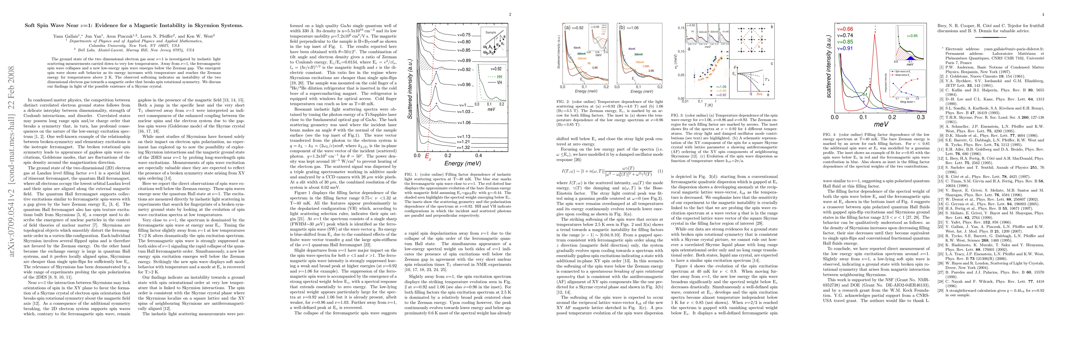 The ground state of the two dimensional electron gas near $\nu$=1 is investigated by inelastic light scattering measurements carried down to very low temperatures. Away from $\nu$=1, the ferromagnetic spin wave collapses and a new low-energy spin wave emerges below the Zeeman gap. The emergent spin wave shows soft behavior as its energy increases with temperature and reaches the Zeeman energy for temperatures above 2 K. The observed softening indicates an instability of the two dimensional electron gas towards a magnetic order that breaks spin rotational symmetry. We discuss our findings in light of the possible existence of a Skyrme crystal.