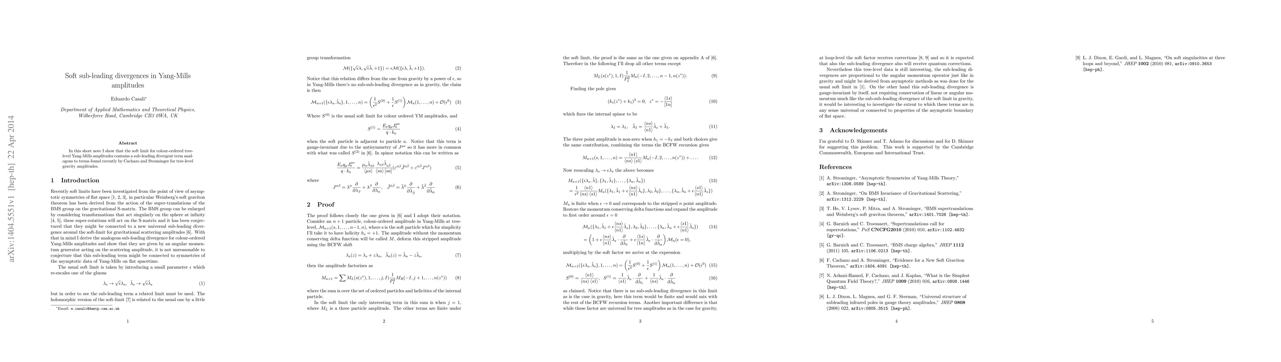 This paper demonstrates that color-ordered tree-level Yang-Mills amplitudes exhibit a sub-leading divergent term in the soft limit, paralleling findings in tree-level gravity amplitudes by Cachazo and Strominger. The result extends insights into soft behavior in quantum field theories beyond gravity.