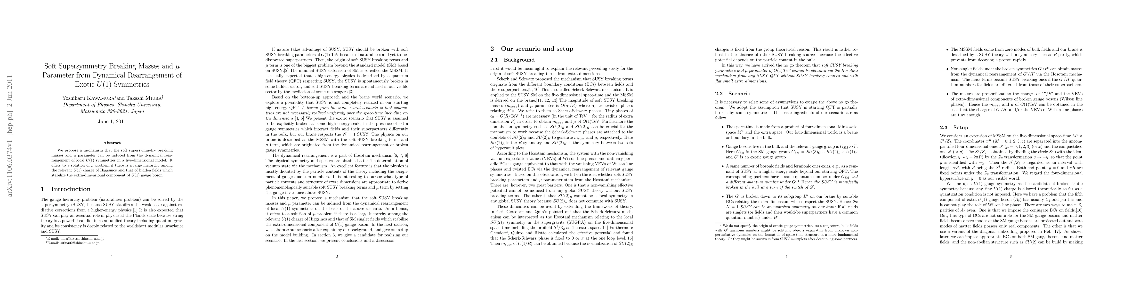 We propose a mechanism that the soft supersymmetry breaking masses and $\mu$ parameter can be induced from the dynamical rearrangement of local U(1) symmetries in a five-dimensional model. It offers to a solution of $\mu$ problem if there is a large hierarchy among the relevant U(1) charge of Higgsinos and that of hidden fields which stabilize the extra-dimensional component of U(1) gauge boson.