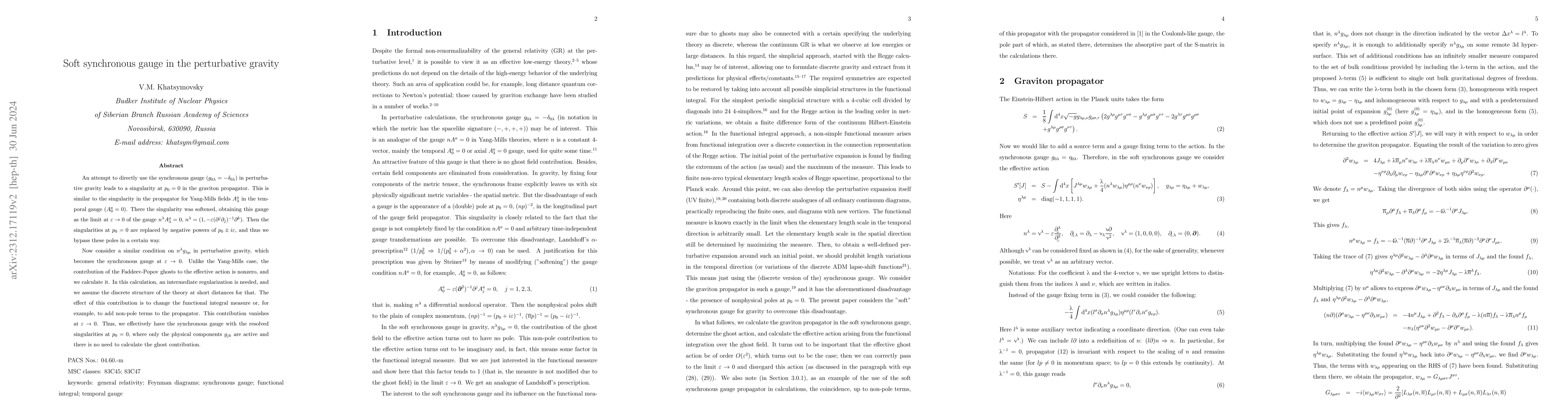 The paper investigates the singularity issue in using the synchronous gauge in perturbative gravity, resolving it through a softened gauge approach similar to the temporal gauge in Yang-Mills theory. The study calculates the non-zero contribution of Faddeev-Popov ghosts in this context, showing that it vanishes as the softened gauge limit is approached, thus allowing a well-defined physical gauge.