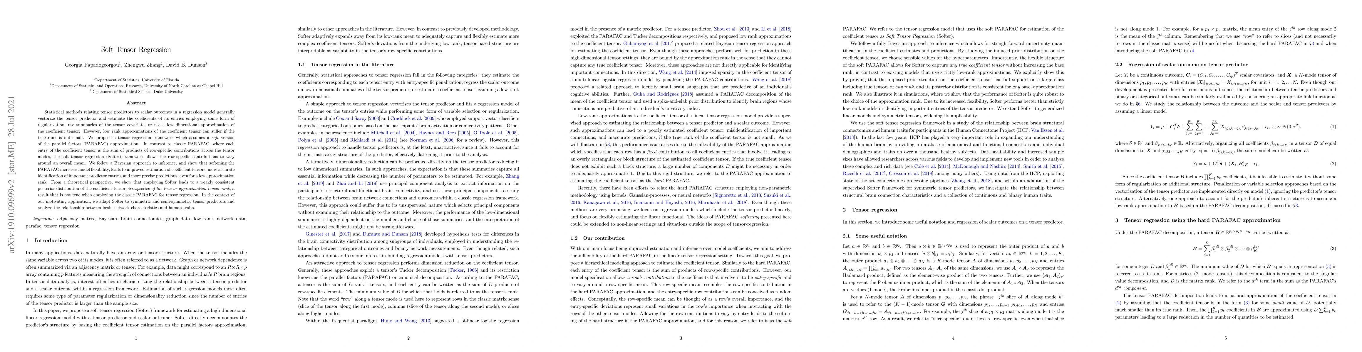 Statistical methods relating tensor predictors to scalar outcomes in a regression model generally vectorize the tensor predictor and estimate the coefficients of its entries employing some form of regularization, use summaries of the tensor covariate, or use a low dimensional approximation of the coefficient tensor. However, low rank approximations of the coefficient tensor can suffer if the true rank is not small. We propose a tensor regression framework which assumes a soft version of the parallel factors (PARAFAC) approximation. In contrast to classic PARAFAC, where each entry of the coefficient tensor is the sum of products of row-specific contributions across the tensor modes, the soft tensor regression (Softer) framework allows the row-specific contributions to vary around an overall mean. We follow a Bayesian approach to inference, and show that softening the PARAFAC increases model flexibility, leads to improved estimation of coefficient tensors, more accurate identification of important predictor entries, and more precise predictions, even for a low approximation rank. From a theoretical perspective, we show that employing Softer leads to a weakly consistent posterior distribution of the coefficient tensor, irrespective of the true or approximation tensor rank, a result that is not true when employing the classic PARAFAC for tensor regression. In the context of our motivating application, we adapt Softer to symmetric and semi-symmetric tensor predictors and analyze the relationship between brain network characteristics and human traits.soft