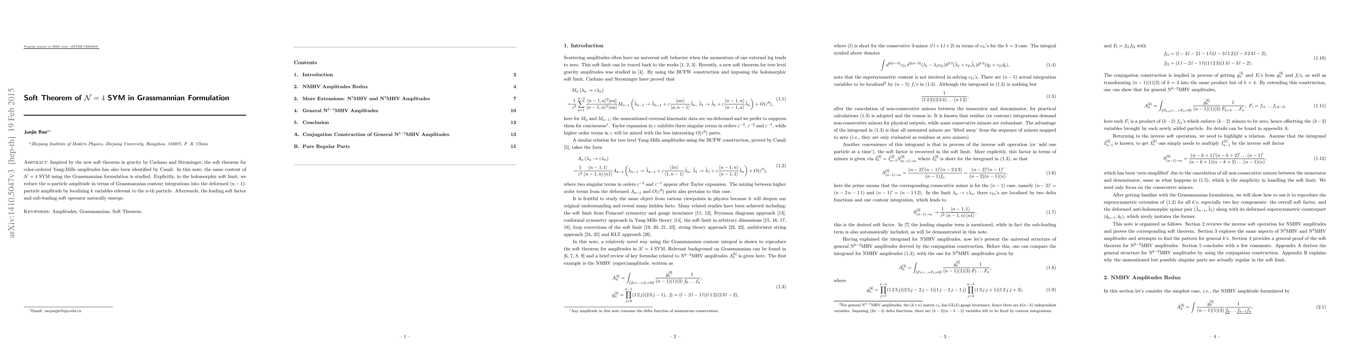 This paper explores the soft theorem for N=4 SYM amplitudes using the Grassmannian formulation, deriving the n-particle amplitude through contour integrations and identifying the leading soft factor and sub-leading soft operator in the holomorphic soft limit.