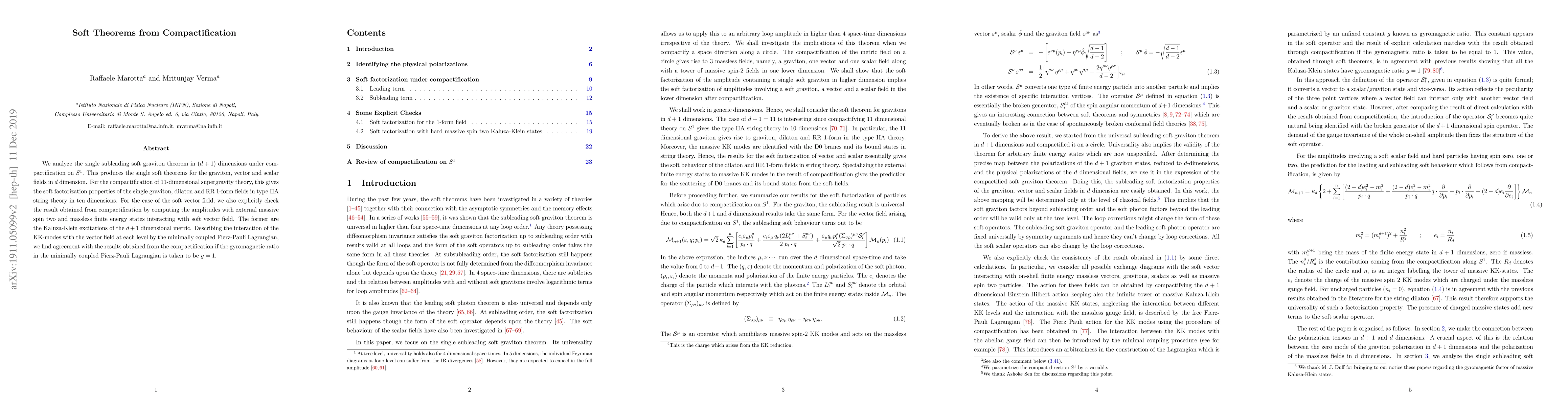 We analyze the single subleading soft graviton theorem in $(d+1)$ dimensions under compactification on $S^1$. This produces the single soft theorems for the graviton, vector and scalar fields in $d$ dimension. For the compactification of $11$-dimensional supergravity theory, this gives the soft factorization properties of the single graviton, dilaton and RR 1-form fields in type IIA string theory in ten dimensions. For the case of the soft vector field, we also explicitly check the result obtained from compactification by computing the amplitudes with external massive spin two and massless finite energy states interacting with soft vector field. The former are the Kaluza-Klein excitations of the $d+1$ dimensional metric. Describing the interaction of the KK-modes with the vector field at each level by the minimally coupled Fierz-Pauli Lagrangian, we find agreement with the results obtained from the compactification if the gyromagnetic ratio in the minimally coupled Fierz-Pauli Lagrangian is taken to be $g=1$.