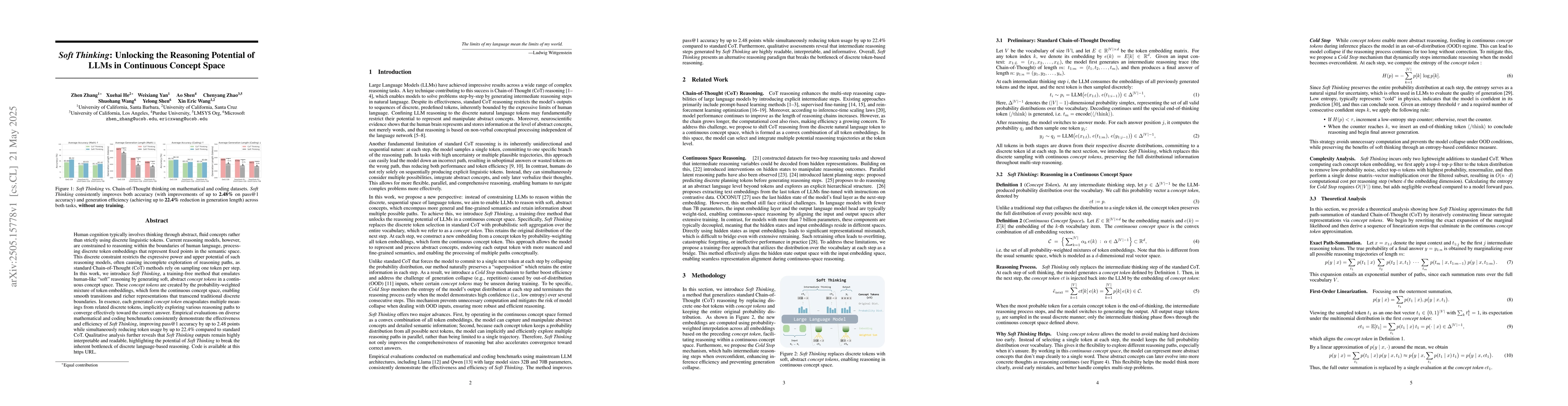 Soft Thinking enables LLMs to generate soft, abstract concept tokens in a continuous space, improving reasoning power and efficiency compared to traditional discrete models.