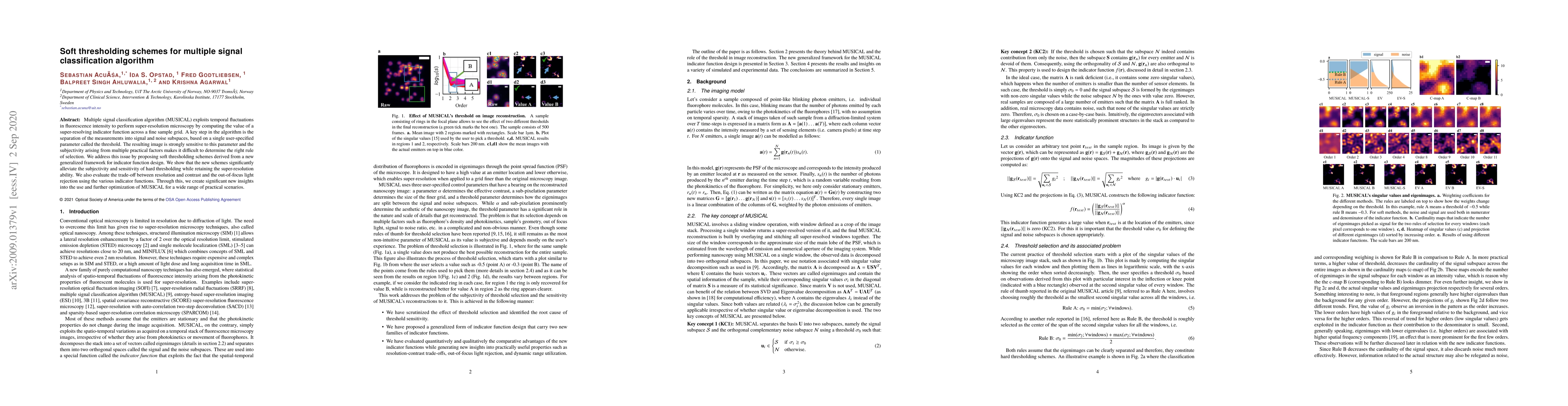 Multiple signal classification algorithm (MUSICAL) exploits temporal fluctuations in fluorescence intensity to perform super-resolution microscopy by computing the value of a super-resolving indicator function across a fine sample grid. A key step in the algorithm is the separation of the measurements into signal and noise subspaces, based on a single user-specified parameter called the threshold. The resulting image is strongly sensitive to this parameter and the subjectivity arising from multiple practical factors makes it difficult to determine the right rule of selection. We address this issue by proposing soft thresholding schemes derived from a new generalized framework for indicator function design. We show that the new schemes significantly alleviate the subjectivity and sensitivity of hard thresholding while retaining the super-resolution ability. We also evaluate the trade-off between resolution and contrast and the out-of-focus light rejection using the various indicator functions. Through this, we create significant new insights into the use and further optimization of MUSICAL for a wide range of practical scenarios.