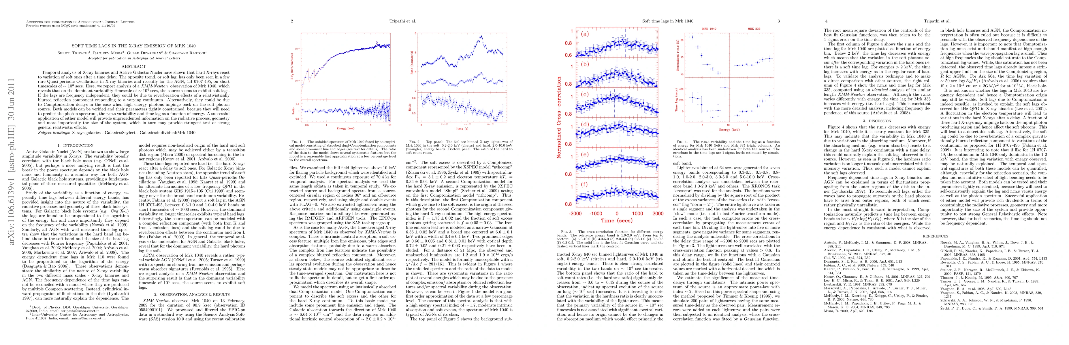 Temporal analysis of X-ray binaries and Active Galactic Nuclei have shown that hard X-rays react to variation of soft ones after a time delay. The opposite trend, or soft lag, has only been seen in a few rare Quasi-periodic Oscillations in X-ray binaries and recently for the AGN, 1H 0707-495, on short timescales of ~ 10^3 secs. Here, we report analysis of a XMM-Newton observation of Mrk~1040, which reveals that on the dominant variability timescale of ~ 10^4 secs, the source seems to exhibit soft lags. If the lags are frequency independent, they could be due to reverberation effects of a relativistically blurred reflection component responding to a varying continuum. Alternatively, they could be due to Comptonization delays in the case when high energy photons impinge back on the soft photon source. Both models can be verified and their parameters tightly constrained, because they will need to predict the photon spectrum, the r.m.s variability and time lag as a function of energy. A successful application of either model will provide unprecedented information on the radiative process, geometry and more importantly the size of the system, which in turn may provide stringent test of strong general relativistic effects.