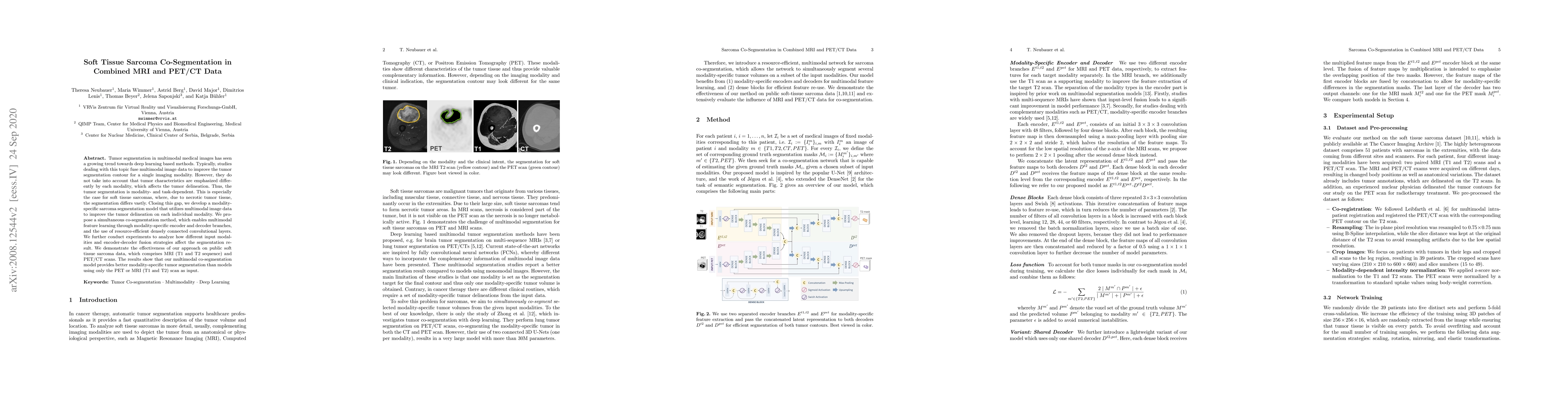 This paper proposes a deep learning model for co-segmentation of soft tissue sarcomas in multimodal MRI and PET/CT data, emphasizing the importance of modality-specific segmentation. The developed simultaneous co-segmentation method enhances tumor delineation by leveraging multimodal feature learning and resource-efficient convolutional layers, leading to superior segmentation results compared to single-modality approaches.