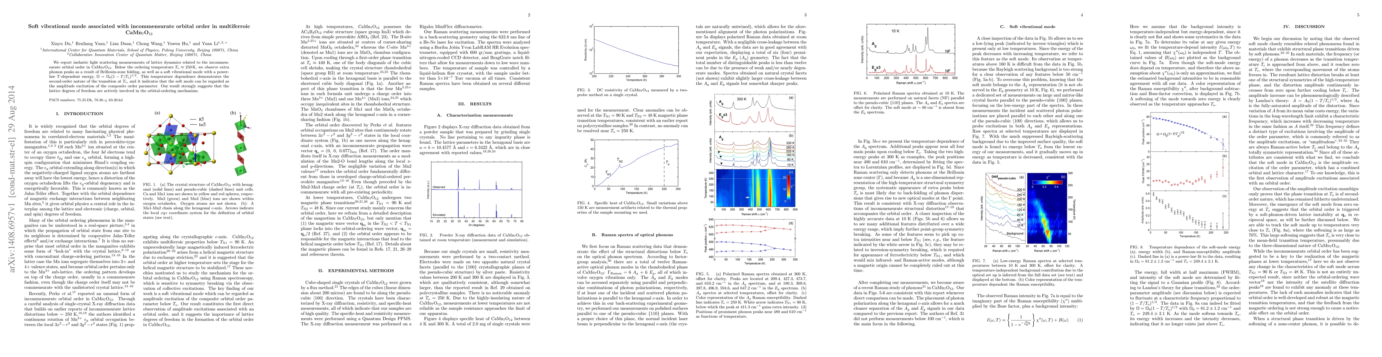 Researchers discovered a soft vibrational mode in CaMn$_7$O_{12}$ related to its incommensurate orbital order, which shows a power-law $T$-dependent energy, indicating the transition is second-order at 250 K.
