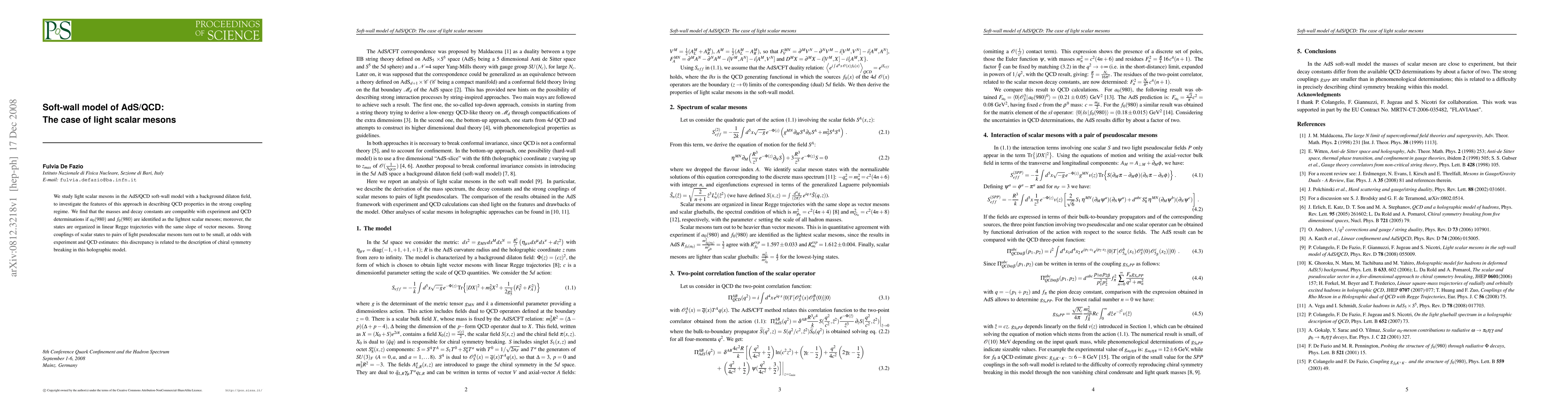 This paper investigates light scalar mesons in the AdS/QCD soft-wall model, finding that their masses and decay constants align with experimental data when $a_0(980)$ and $f_0(980)$ are considered. However, the model's description of chiral symmetry breaking leads to discrepancies in the predicted strong couplings to pseudoscalar mesons.
