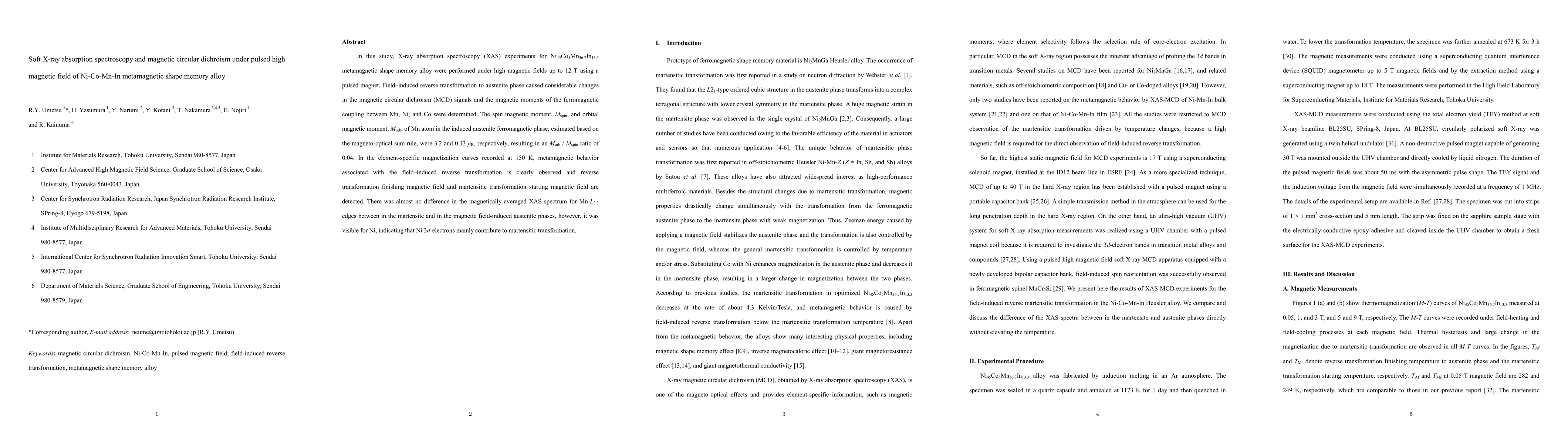 This study investigates the magnetic properties of Ni-Co-Mn-In metamagnetic shape memory alloy using X-ray absorption spectroscopy under high magnetic fields. The research reveals significant changes in magnetic circular dichroism signals and identifies the magnetic moments of Mn, Ni, and Co in the austenite phase, with Mn's spin and orbital moments determined to be 3.2 and 0.13 μB respectively. The study also observes metamagnetic behavior linked to field-induced phase transformation.