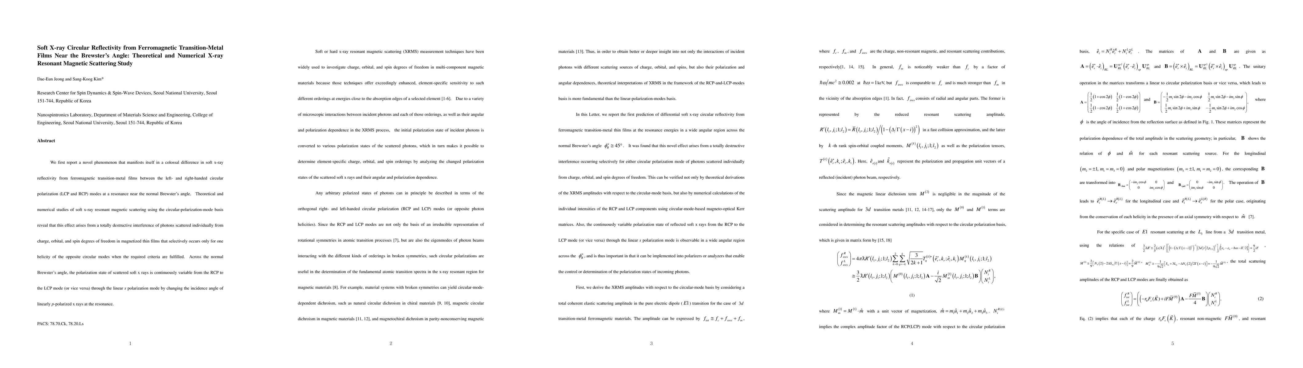 This study reveals a significant difference in soft x-ray reflectivity from ferromagnetic transition-metal films between left- and right-handed circular polarization modes near Brewster's angle, attributed to destructive interference of scattered photons from charge and spin degrees of freedom. The polarization state of scattered x-rays varies continuously through linear polarization by adjusting the incidence angle.
