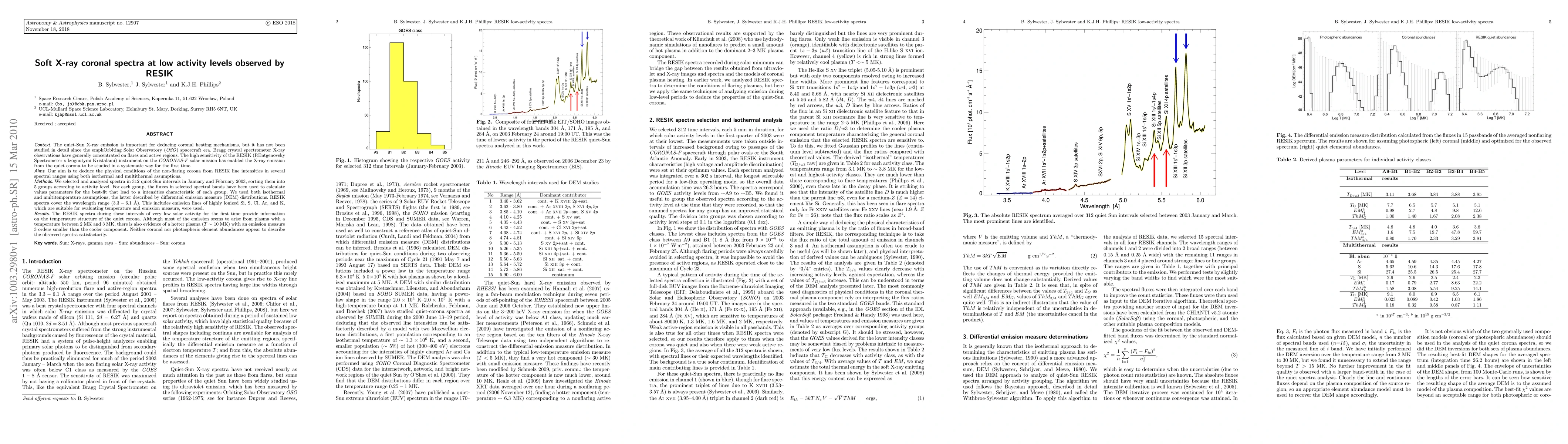 This study uses RESIK spectrometer data from the CORONAS-F mission to analyze quiet-Sun X-ray spectra during low solar activity, revealing a temperature structure in the non-flaring corona with most emission from plasma at 2-3 MK, alongside a hotter component at ~10 MK. Neither coronal nor photospheric abundances fully explain the observed spectral lines.