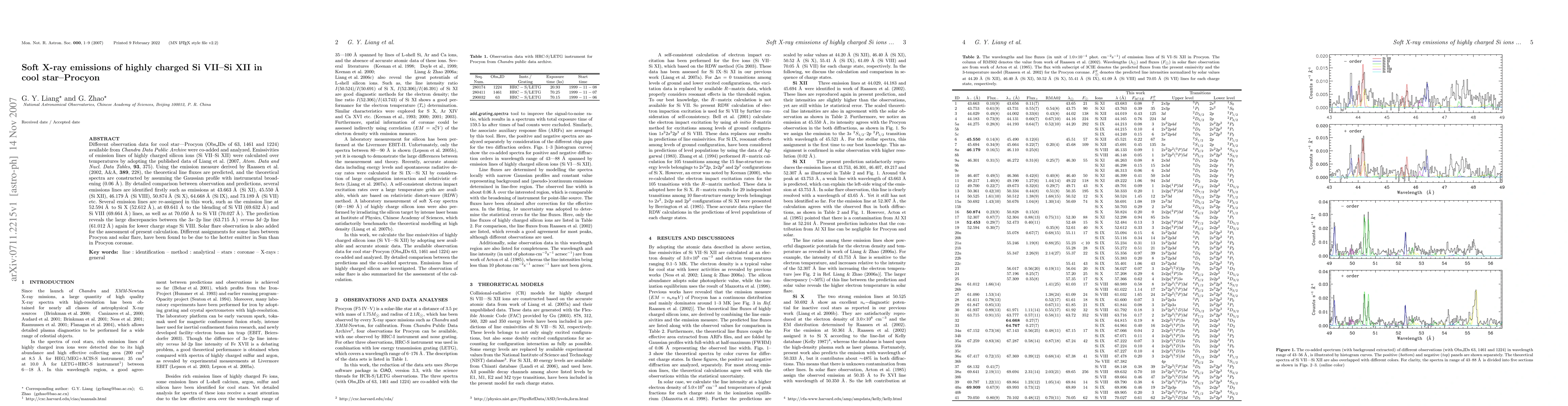 Different observation data for cool star--Procyon (Obs\_IDs of 63, 1461 and 1224) available from {\it Chandra Data Public Archive} were co-added and analyzed. Emissivities of emission lines of highly charged silicon ions (Si VII--Si XII) were calculated over temperatures by adopting the published data of Liang et al. (2007, {\it Atom. Data and Nucl. Data Tables}, {\bf 93}, 375). Using the emission measure derived by Raassen et al. (2002, A&A, {\bf 389}, 228), the theoretical line fluxes are predicted, and the theoretical spectra are constructed by assuming the Gaussian profile with instrumental broadening (0.06 \AA). By detailed comparison between observation and predictions, several emissions lines are identified firstly such as emissions at 43.663 \AA (Si XI), 45.550 \AA (Si XII), 46.179 \AA (Si VIII), 50.874 \AA (Si X), 64.668 \AA (Si IX), and 73.189 \AA (Si VII) etc. Several emission lines are re-assigned in this work, such as the emission line at 52.594 \AA to Si X (52.612 \AA), at 69.641 \AA to the blending of Si VII (69.632 \AA) and Si VIII (69.664 \AA) lines, as well as at 70.050 \AA to Si VII (70.027 \AA). The prediction reveals the large discrepancies between the $3s$--$2p$ line (63.715 \AA) {\it versus} 3d--$2p$ line (61.012 \AA) again for lower charge stage Si VIII. Solar flare observation is also added for the assessment of present calculation. Different assignments for some lines between Procyon and solar flare, have been found to be due to the hotter emitter in Sun than in Procyon coronae.