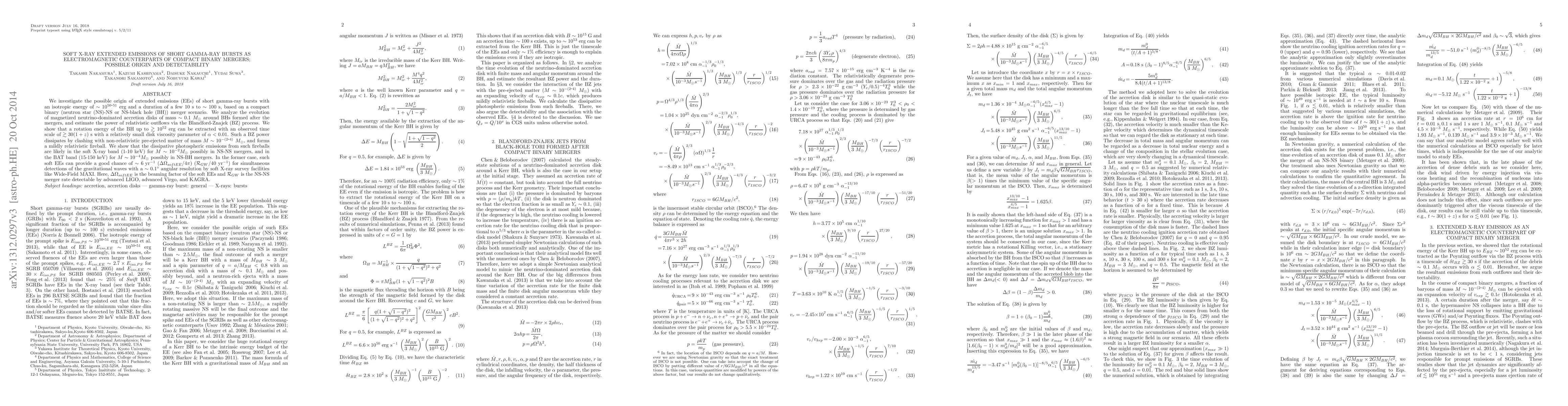 We investigate the possible origin of extended emissions (EEs) of short gamma-ray bursts with an isotropic energy of ~ 10^(50-51) erg and a duration of a few 10 s to ~ 100 s, based on a compact binary (neutron star (NS)-NS or NS-black hole (BH)) merger scenario. We analyze the evolution of magnetized neutrino-dominated accretion disks of mass ~ 0.1 M_sun around BHs formed after the mergers, and estimate the power of relativistic outflows via the Blandford-Znajek (BZ) process. We show that a rotation energy of the BH up to > 10^52 erg can be extracted with an observed time scale of > 30 (1+z) s with a relatively small disk viscosity parameter of alpha < 0.01. Such a BZ power dissipates by clashing with non-relativistic pre-ejected matter of mass M ~ 10^-(2-4) M_sun, and forms a mildly relativistic fireball. We show that the dissipative photospheric emissions from such fireballs are likely in the soft X-ray band (1-10 keV) for M ~ 10^-2 M_sun possibly in NS-NS mergers, and in the BAT band (15-150 keV) for M ~ 10^-4 M_sun possibly in NS-BH mergers. In the former case, such soft EEs can provide a good chance of ~ 6 yr^-1 for simultaneous detections of the gravitational waves with a ~ 0.1 deg angular resolution by soft X-ray survey facilities like Wide-Field MAXI.