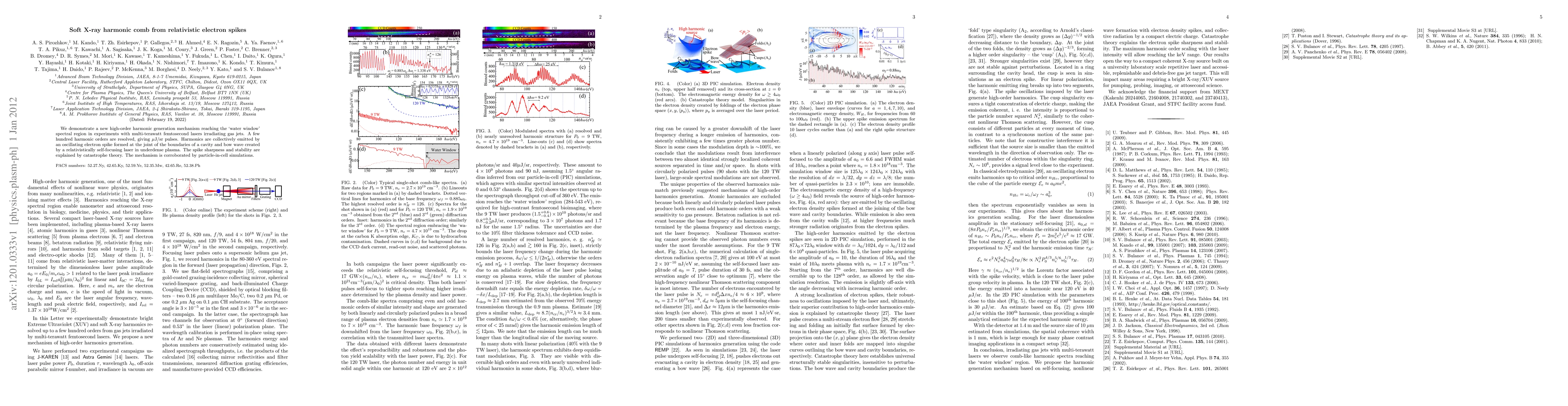 We demonstrate a new high-order harmonic generation mechanism reaching the `water window' spectral region in experiments with multi-terawatt femtosecond lasers irradiating gas jets. A few hundred harmonic orders are resolved, giving uJ/sr pulses. Harmonics are collectively emitted by an oscillating electron spike formed at the joint of the boundaries of a cavity and bow wave created by a relativistically self-focusing laser in underdense plasma. The spike sharpness and stability are explained by catastrophe theory. The mechanism is corroborated by particle-in-cell simulations.
