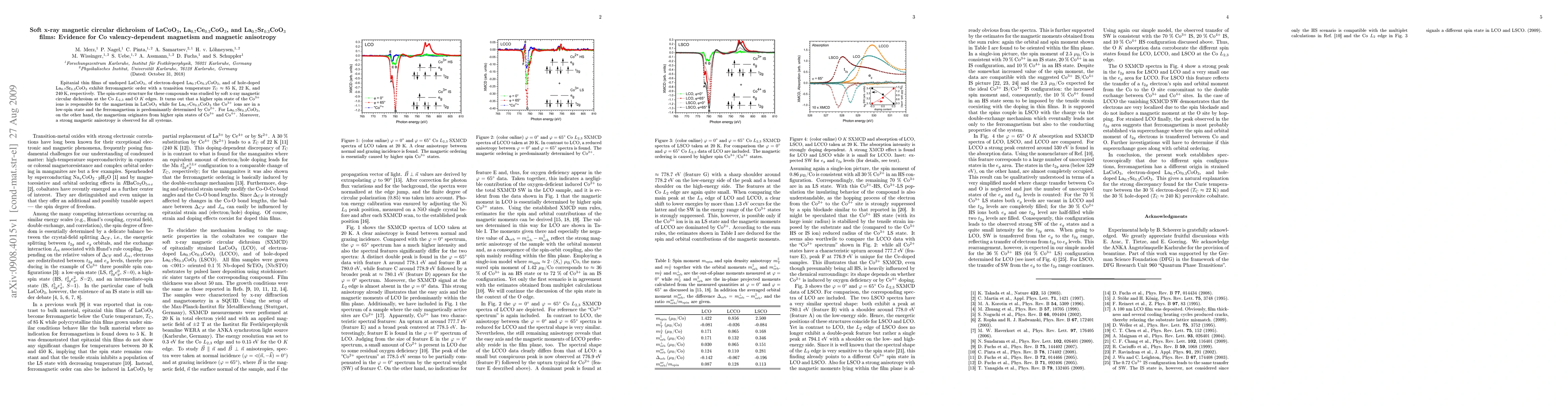 This paper investigates the magnetic properties of epitaxial thin films of LaCoO$_3$, La$_{0.7}$Ce$_{0.3}$CoO$_3$, and La$_{0.7}$Sr$_{0.3}$CoO$_3$ using soft x-ray magnetic circular dichroism. The study reveals that Co valency and spin states significantly influence magnetism and magnetic anisotropy in these materials.