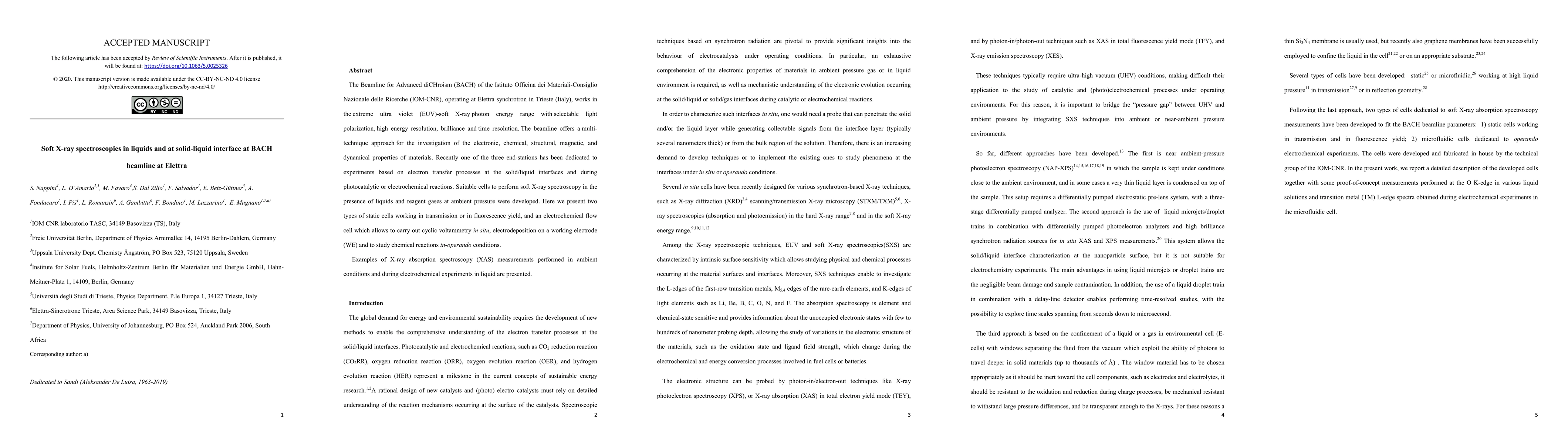 The Beamline for Advanced diCHroism (BACH) of the Istituto Officina dei Materiali-Consiglio Nazionale delle Ricerche (IOM-CNR), operating at Elettra synchrotron in Trieste (Italy), works in the extreme ultra violet (EUV)-soft X-ray photon energy range with selectable light polarization, high energy resolution, brilliance and time resolution. The beamline offers a multi-technique approach for the investigation of the electronic, chemical, structural, magnetic, and dynamical properties of materials. Recently one of the three end-stations has been dedicated to experiments based on electron transfer processes at the solid/liquid interfaces and during photocatalytic or electrochemical reactions. Suitable cells to perform soft X-ray spectroscopy in the presence of liquids and reagent gases at ambient pressure were developed. Here we present two types of static cells working in transmission or in fluorescence yield, and an electrochemical flow cell which allows to carry out cyclic voltammetry in situ, electrodeposition on a working electrode (WE) and to study chemical reactions in-operando conditions. Examples of X-ray absorption spectroscopy (XAS) measurements performed in ambient conditions and during electrochemical experiments in liquid are presented.