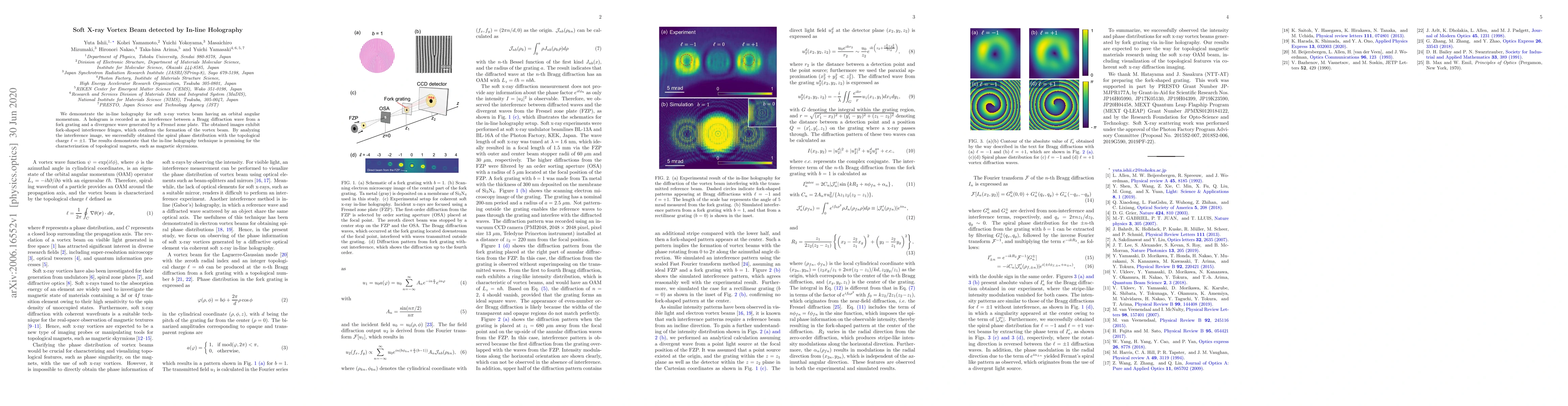 This paper demonstrates the use of in-line holography to detect a soft x-ray vortex beam with orbital angular momentum, confirming its formation through fork-shaped interference fringes. The technique shows promise for characterizing topological magnets like magnetic skyrmions.