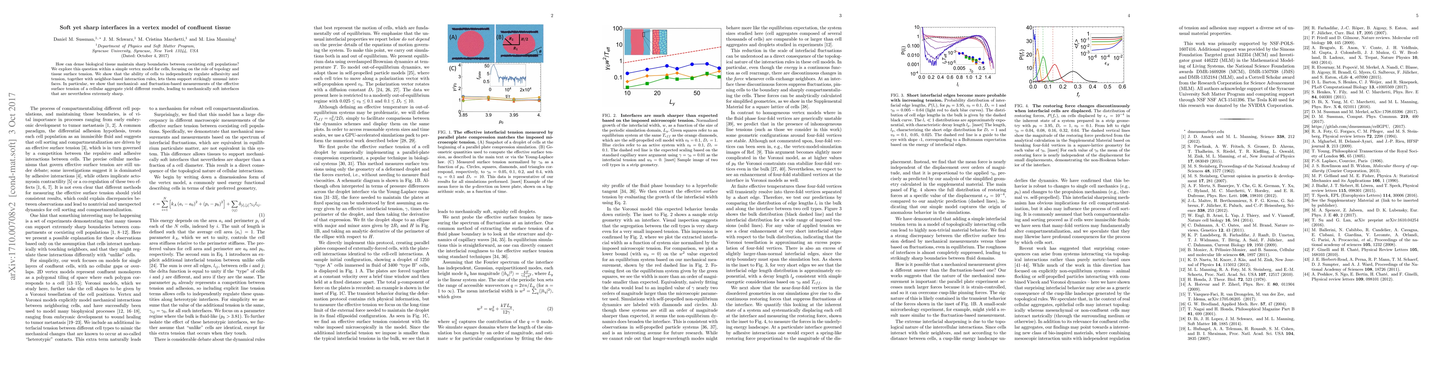 This paper investigates how dense biological tissue maintains sharp boundaries between cell populations using a vertex model, demonstrating that cells can regulate adhesivity and tension to create soft yet sharp interfaces. It reveals that mechanical and fluctuation-based measurements yield different effective surface tension values, resulting in mechanically soft but sharply defined interfaces.