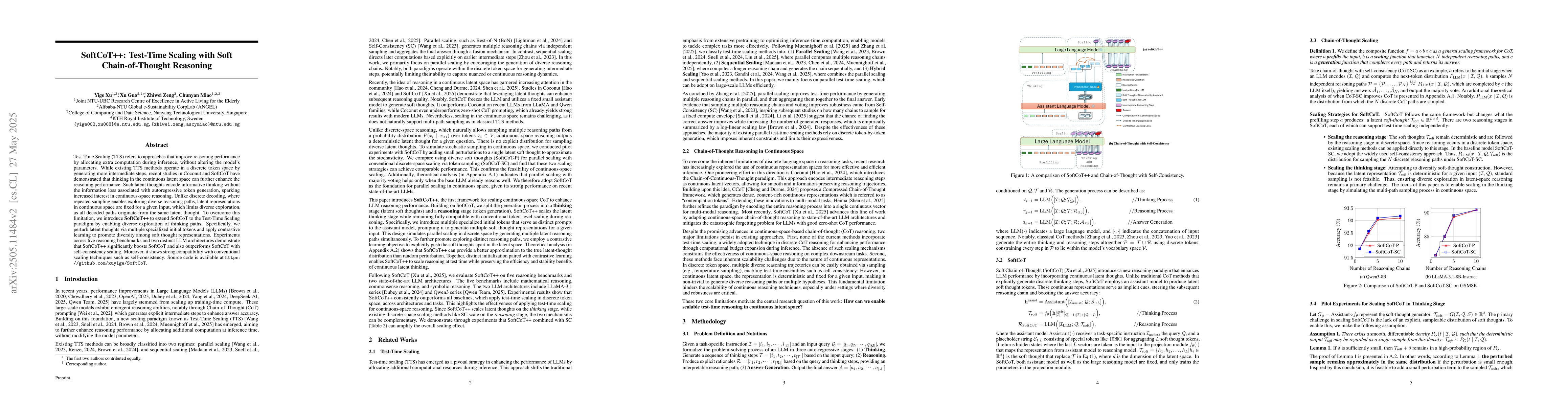 SoftCoT++ extends SoftCoT to the Test-Time Scaling paradigm by perturbing latent thoughts via multiple specialized initial tokens and applying contrastive learning to promote diversity among soft thought representations.