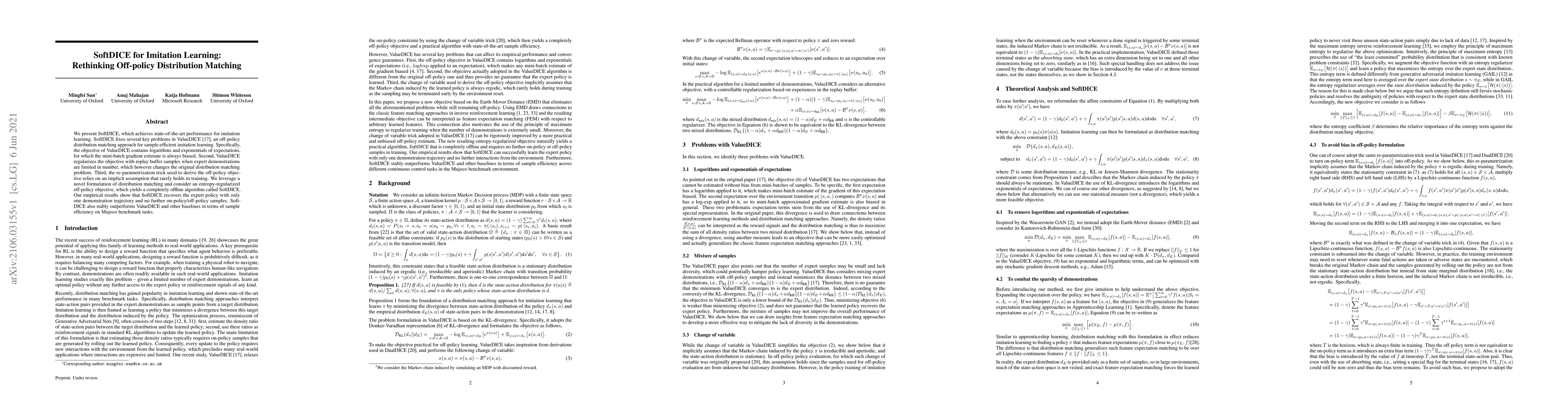 We present SoftDICE, which achieves state-of-the-art performance for imitation learning. SoftDICE fixes several key problems in ValueDICE, an off-policy distribution matching approach for sample-efficient imitation learning. Specifically, the objective of ValueDICE contains logarithms and exponentials of expectations, for which the mini-batch gradient estimate is always biased. Second, ValueDICE regularizes the objective with replay buffer samples when expert demonstrations are limited in number, which however changes the original distribution matching problem. Third, the re-parametrization trick used to derive the off-policy objective relies on an implicit assumption that rarely holds in training. We leverage a novel formulation of distribution matching and consider an entropy-regularized off-policy objective, which yields a completely offline algorithm called SoftDICE. Our empirical results show that SoftDICE recovers the expert policy with only one demonstration trajectory and no further on-policy/off-policy samples. SoftDICE also stably outperforms ValueDICE and other baselines in terms of sample efficiency on Mujoco benchmark tasks.