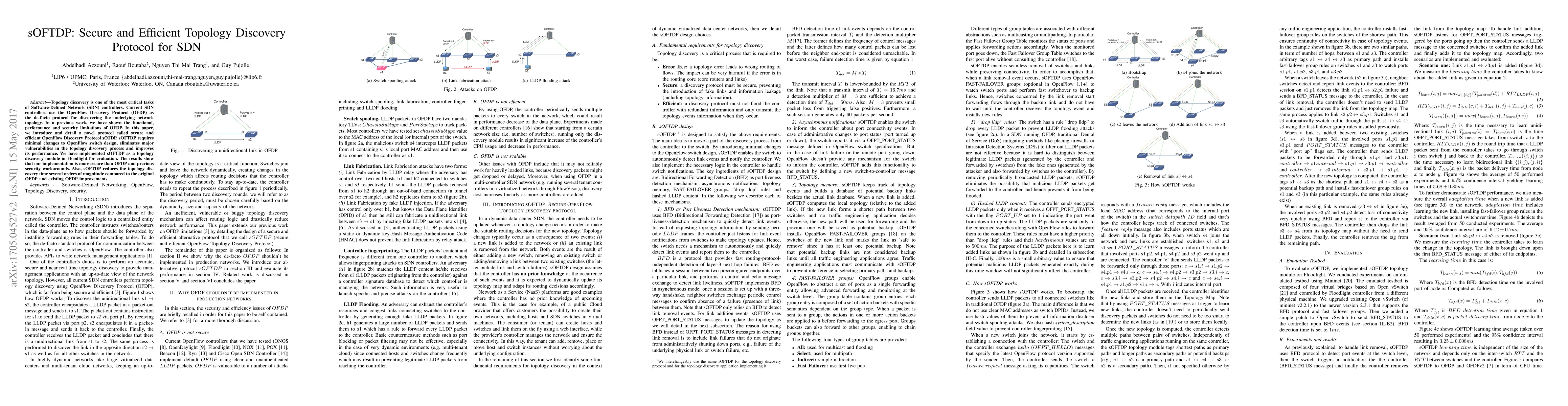 This research introduces sOFTDP, a secure and efficient topology discovery protocol for SDN that addresses major vulnerabilities in the topology discovery process, improves performance, and requires minimal changes to OpenFlow switch design.
