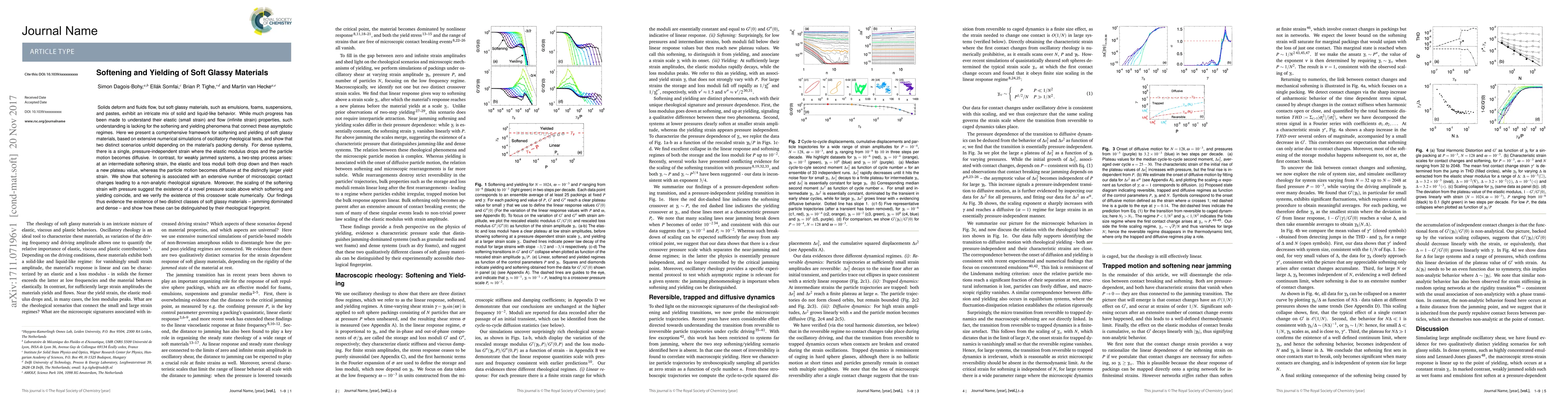 This paper presents a framework for understanding the softening and yielding phenomena in soft glassy materials, revealing two distinct scenarios based on packing density. For dense materials, a single strain marks the transition from elastic to diffusive behavior, while weakly jammed materials exhibit a two-step process with distinct softening and yield strains. The study identifies a novel pressure scale where softening and yielding coincide.