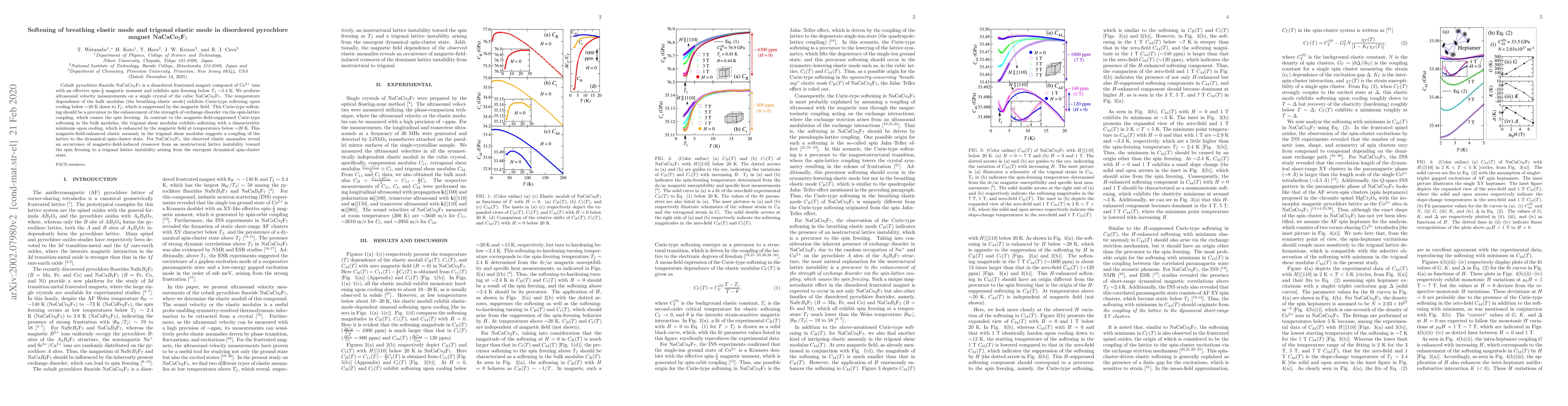The research investigates the ultrasound velocity in disordered pyrochlore magnet NaCaCo$_2$F$_7$, revealing Curie-type softening in the bulk modulus below 20K, suppressed by magnetic fields, indicating lattice-spin coupling leading to spin freezing. In contrast, the trigonal shear modulus softens with a minimum enhanced by magnetic fields, suggesting a lattice coupling to dynamical spin-clusters, showcasing a magnetic-field-induced crossover from lattice instability to spin freezing.
