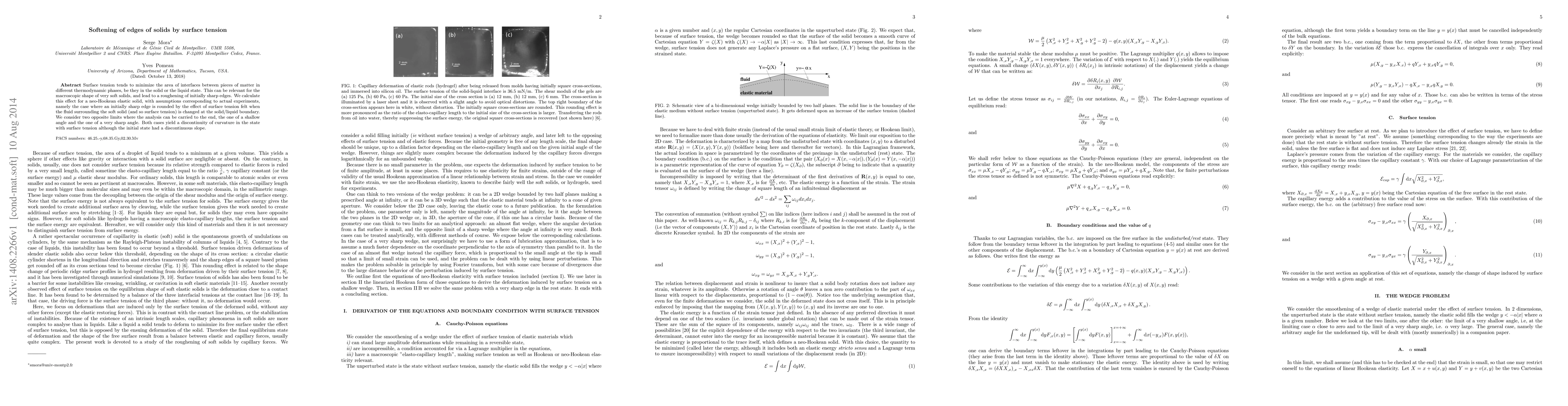 This paper investigates how surface tension influences the softening of edges in neo-Hookean elastic solids, leading to edge rounding. It analyzes two edge angle limits, revealing a discontinuity of curvature due to surface tension despite the initial sharp edge.