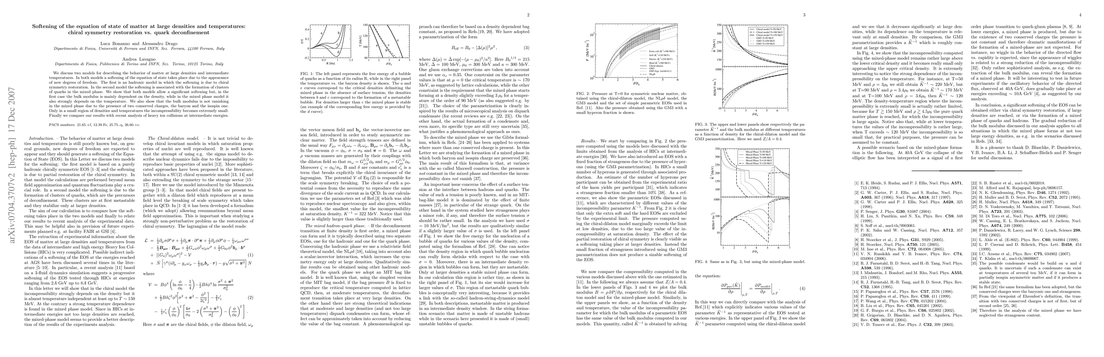 We discuss two models for describing the behavior of matter at large densities and intermediate temperatures. In both models a softening of the equation of state takes place due to the appearance of new degrees of freedom. The first is a hadronic model in which the softening is due to chiral symmetry restoration. In the second model the softening is associated with the formation of clusters of quarks in the mixed phase. We show that both models allow a significant softening but, in the first case the bulk modulus is mainly dependent on the density, while in the mixed phase model it also strongly depends on the temperature. We also show that the bulk modulus is not vanishing in the mixed phase due to the presence of two conserved charges, the baryon and the isospin one. Only in a small region of densities and temperatures the incompressibility becomes extremely small. Finally we compare our results with recent analysis of heavy ion collisions at intermediate energies.