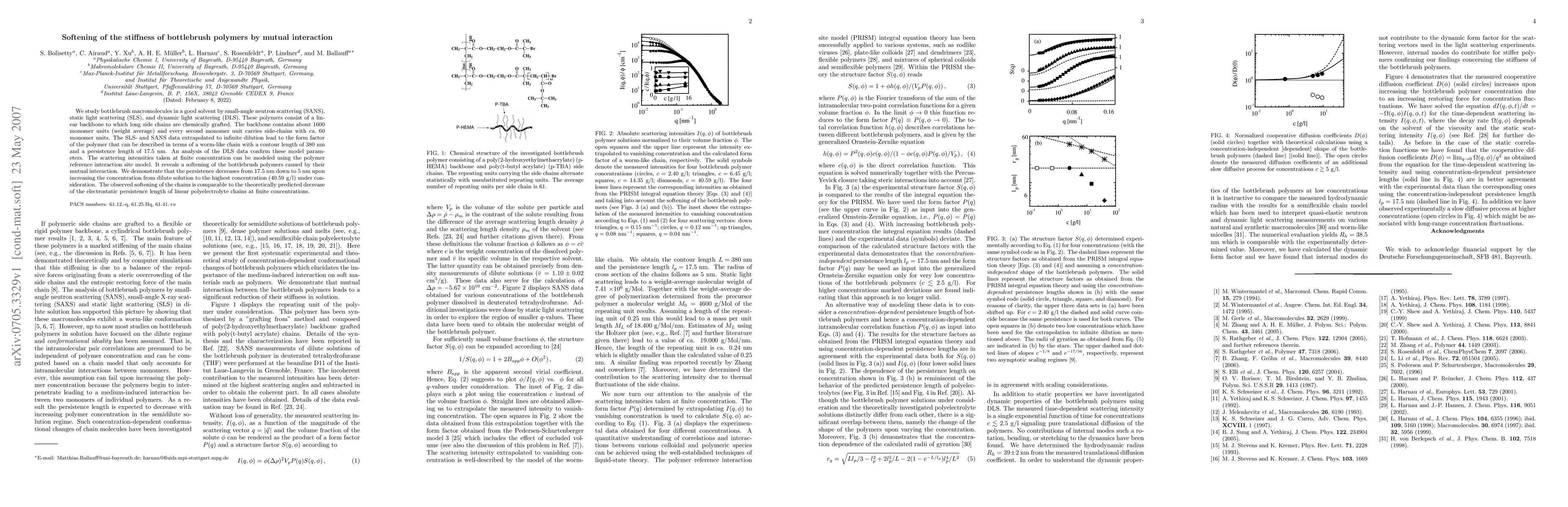 We study bottlebrush macromolecules in a good solvent by small-angle neutron scattering (SANS), static light scattering (SLS), and dynamic light scattering (DLS). These polymers consist of a linear backbone to which long side chains are chemically grafted. The backbone contains about 1600 monomer units (weight average) and every second monomer unit carries side-chains with ca. 60 monomer units. The SLS- and SANS data extrapolated to infinite dilution lead to the form factor of the polymer that can be described in terms of a worm-like chain with a contour length of 380 nm and a persistence length of 17.5 nm. An analysis of the DLS data confirm these model parameters. The scattering intensities taken at finite concentration can be modeled using the polymer reference interaction site model. It reveals a softening of the bottlebrush polymers caused by their mutual interaction. We demonstrate that the persistence decreases from 17.5 nm down to 5 nm upon increasing the concentration from dilute solution to the highest concentration 40.59 g/l under consideration. The observed softening of the chains is comparable to the theoretically predicted decrease of the electrostatic persistence length of linear polyelectrolyte chains at finite concentrations.