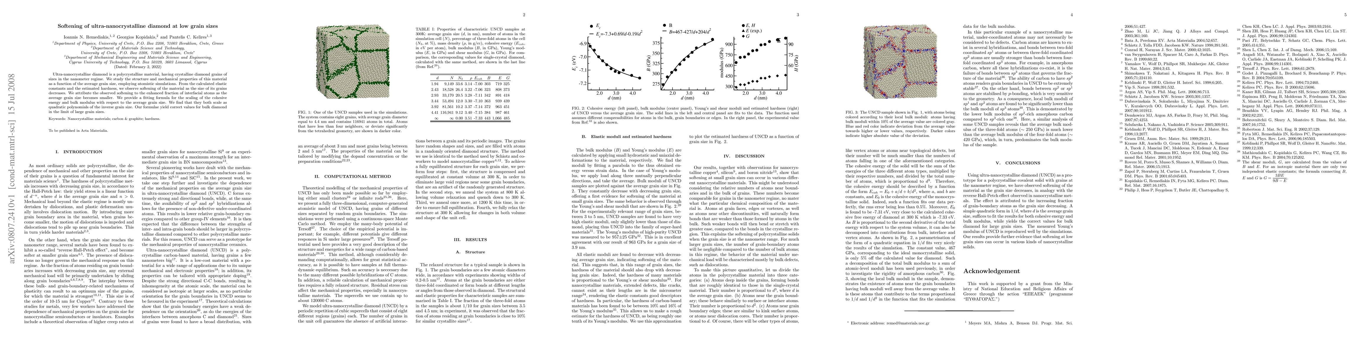 This paper investigates the mechanical properties of ultra-nanocrystalline diamond through atomistic simulations, revealing that the material softens as grain size decreases. The softening is attributed to a higher fraction of interfacial atoms in smaller grains, and the study provides a fitting formula showing that the cohesive energy and bulk modulus scale quadratically with the inverse grain size.
