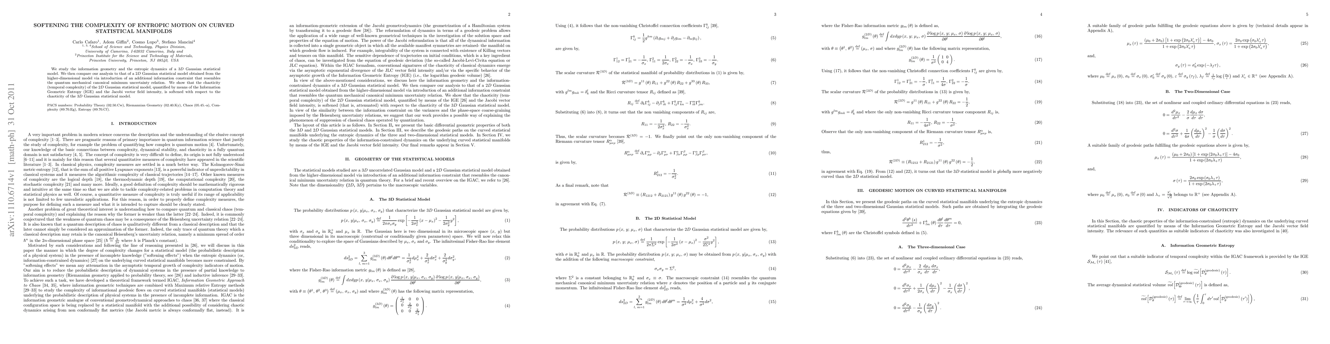 We study the information geometry and the entropic dynamics of a 3D Gaussian statistical model. We then compare our analysis to that of a 2D Gaussian statistical model obtained from the higher-dimensional model via introduction of an additional information constraint that resembles the quantum mechanical canonical minimum uncertainty relation. We show that the chaoticity (temporal complexity) of the 2D Gaussian statistical model, quantified by means of the Information Geometric Entropy (IGE) and the Jacobi vector field intensity, is softened with respect to the chaoticity of the 3D Gaussian statistical model.