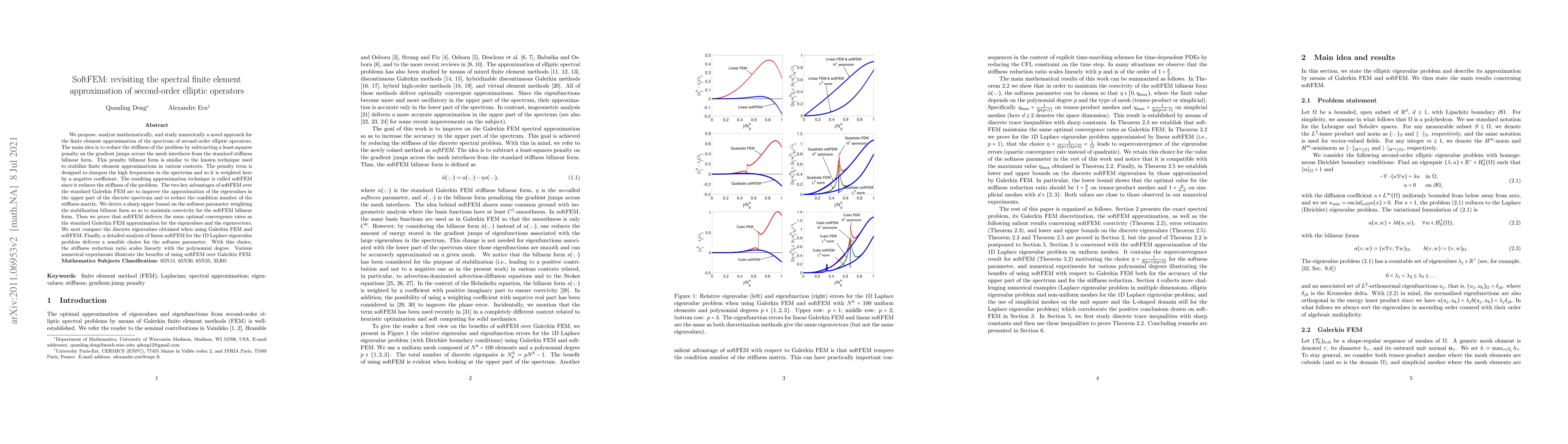 We propose, analyze mathematically, and study numerically a novel approach for the finite element approximation of the spectrum of second-order elliptic operators. The main idea is to reduce the stiffness of the problem by subtracting a least-squares penalty on the gradient jumps across the mesh interfaces from the standard stiffness bilinear form. This penalty bilinear form is similar to the known technique used to stabilize finite element approximations in various contexts. The penalty term is designed to dampen the high frequencies in the spectrum and so it is weighted here by a negative coefficient. The resulting approximation technique is called softFEM since it reduces the stiffness of the problem. The two key advantages of softFEM over the standard Galerkin FEM are to improve the approximation of the eigenvalues in the upper part of the discrete spectrum and to reduce the condition number of the stiffness matrix. We derive a sharp upper bound on the softness parameter weighting the stabilization bilinear form so as to maintain coercivity for the softFEM bilinear form. Then we prove that softFEM delivers the same optimal convergence rates as the standard Galerkin FEM approximation for the eigenvalues and the eigenvectors. We next compare the discrete eigenvalues obtained when using Galerkin FEM and softFEM. Finally, a detailed analysis of linear softFEM for the 1D Laplace eigenvalue problem delivers a sensible choice for the softness parameter. With this choice, the stiffness reduction ratio scales linearly with the polynomial degree. Various numerical experiments illustrate the benefits of using softFEM over Galerkin FEM.