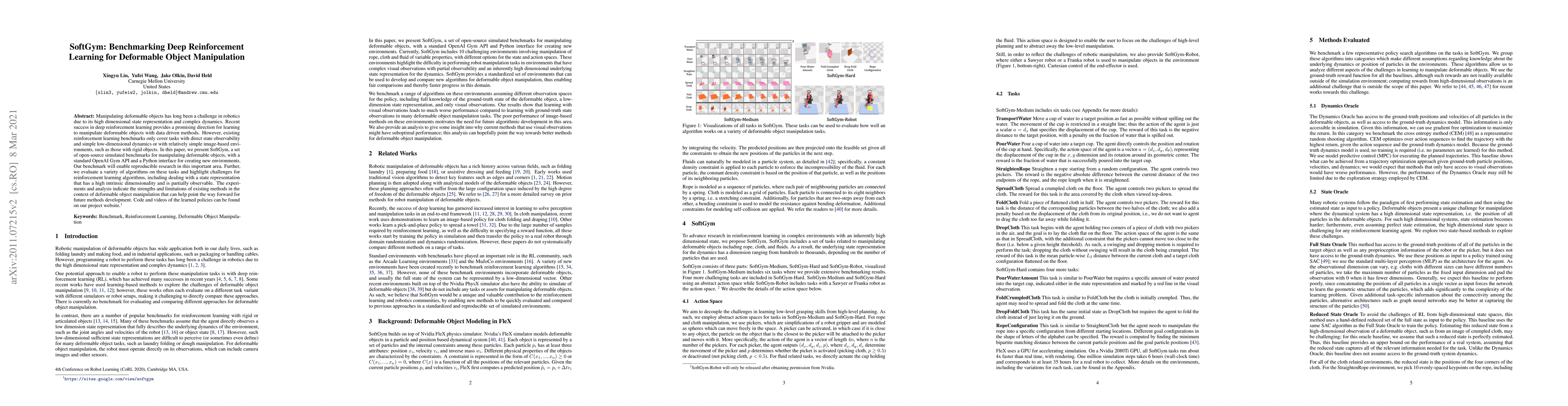 SoftGym introduces a suite of simulated benchmarks for deep reinforcement learning in deformable object manipulation, addressing the challenges of high-dimensional state representation and complex dynamics. The study evaluates various algorithms on these tasks, highlighting the strengths and limitations of current methods and providing a foundation for future research.