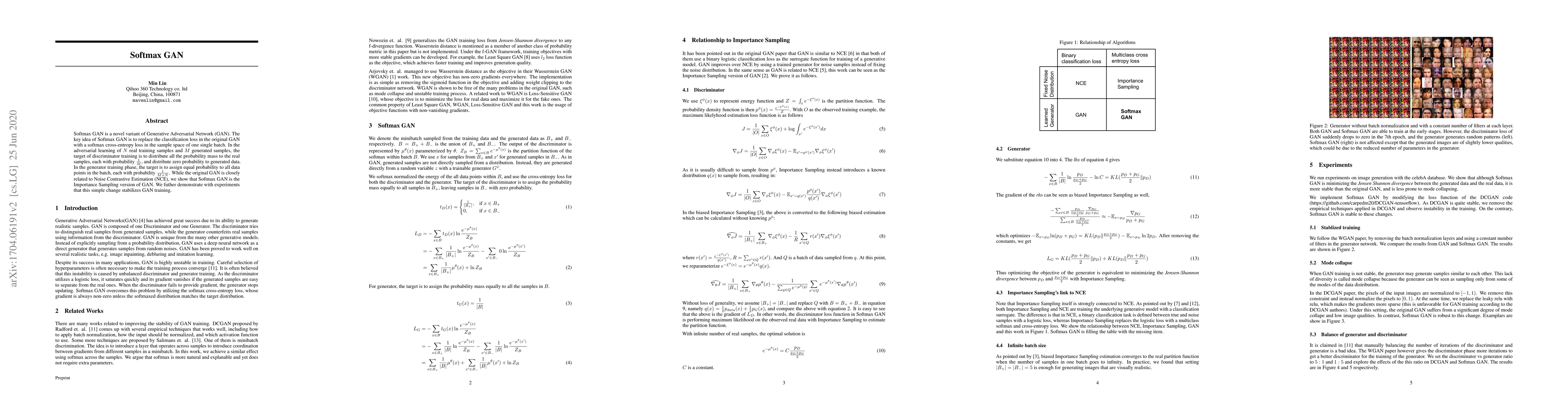 Softmax GAN is a novel variant of Generative Adversarial Network (GAN). The key idea of Softmax GAN is to replace the classification loss in the original GAN with a softmax cross-entropy loss in the sample space of one single batch. In the adversarial learning of $N$ real training samples and $M$ generated samples, the target of discriminator training is to distribute all the probability mass to the real samples, each with probability $\frac{1}{M}$, and distribute zero probability to generated data. In the generator training phase, the target is to assign equal probability to all data points in the batch, each with probability $\frac{1}{M+N}$. While the original GAN is closely related to Noise Contrastive Estimation (NCE), we show that Softmax GAN is the Importance Sampling version of GAN. We futher demonstrate with experiments that this simple change stabilizes GAN training.