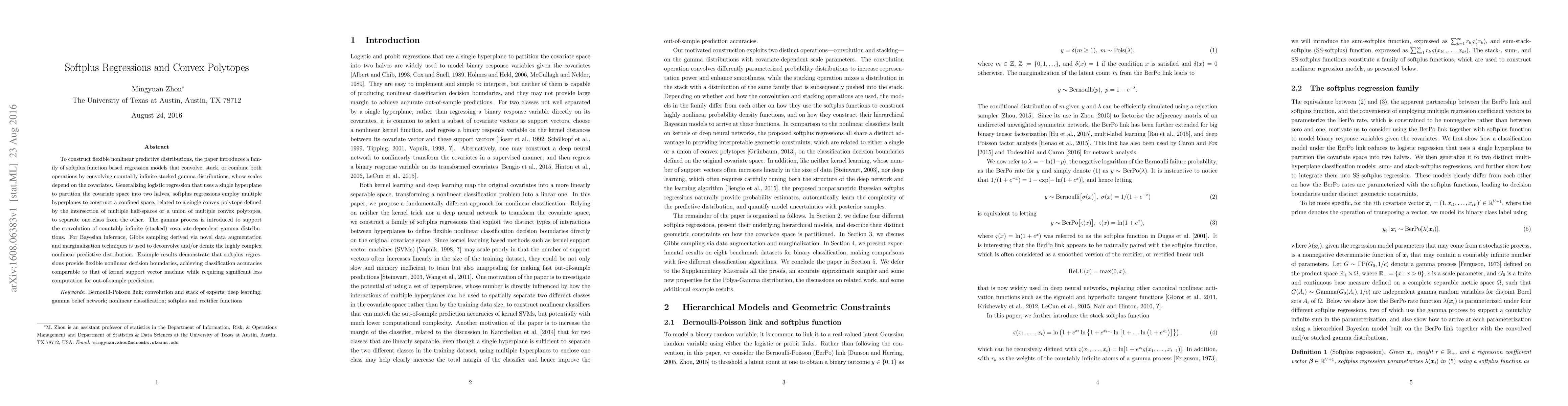 This paper introduces softplus regression models based on softplus functions and convex polytopes for flexible nonlinear predictive distributions. It employs multiple hyperplanes to define complex decision boundaries, achieving classification accuracy comparable to kernel support vector machines with less computational cost.